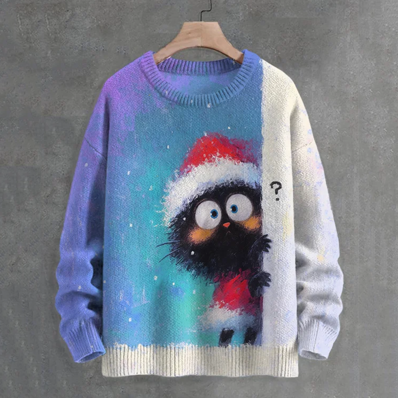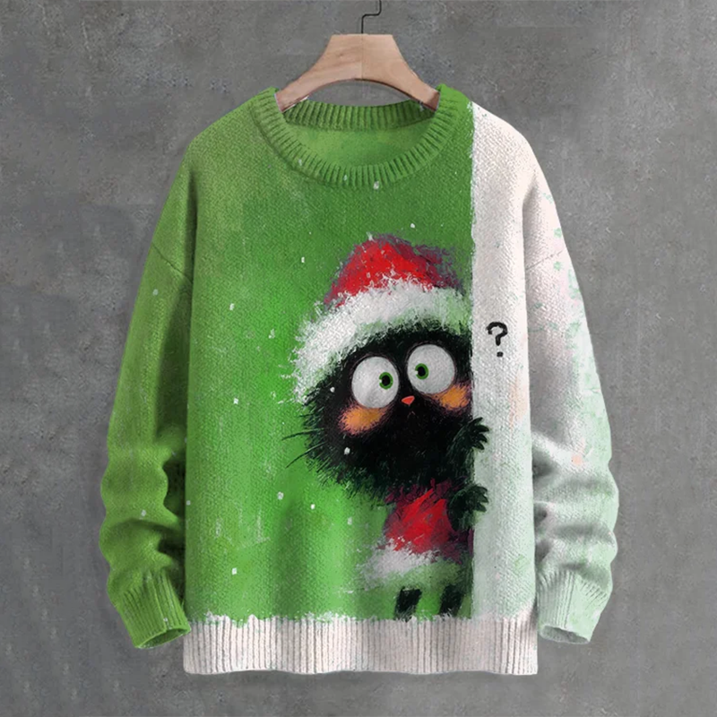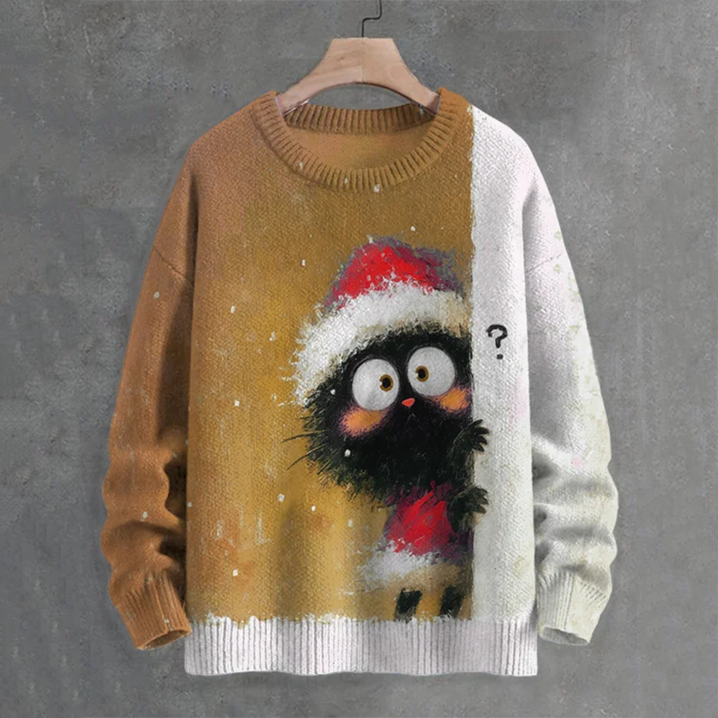 Men's Black Cat In Christmas Costume Hiding Art Print Casual Knit Crew Neck Sweater