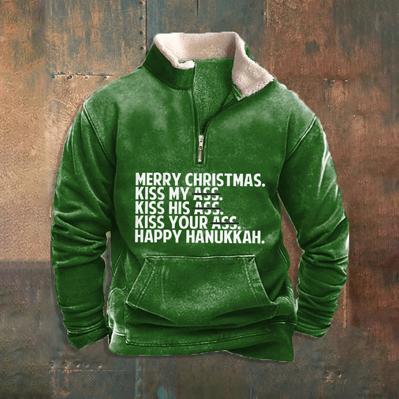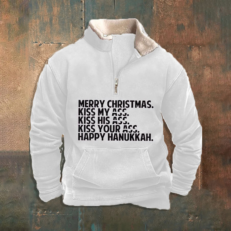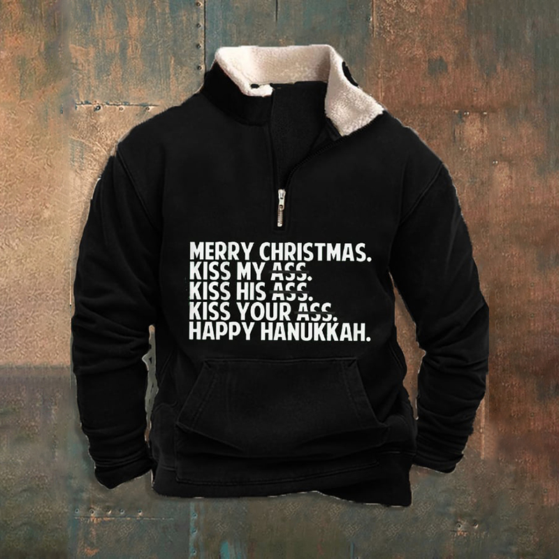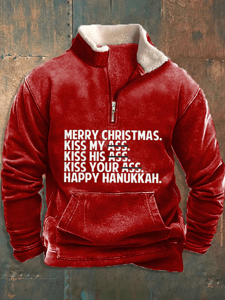 Men's Funny Merry Christmas Merry Kiss My Ass Printed Zipper Fur Collar Sweatshirt