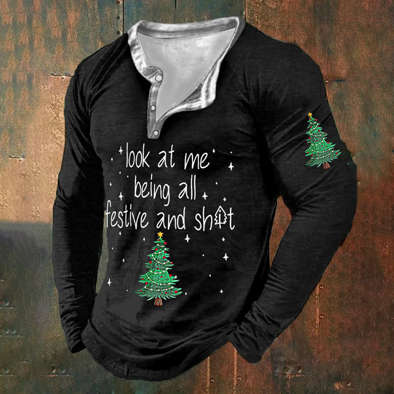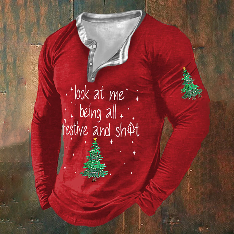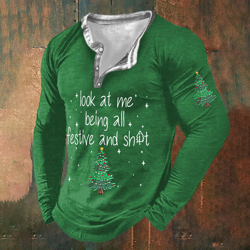 Men's Funny Christmas Look At Me Being All Festive And Christmas Tree Print Henley Collar T-Shirt