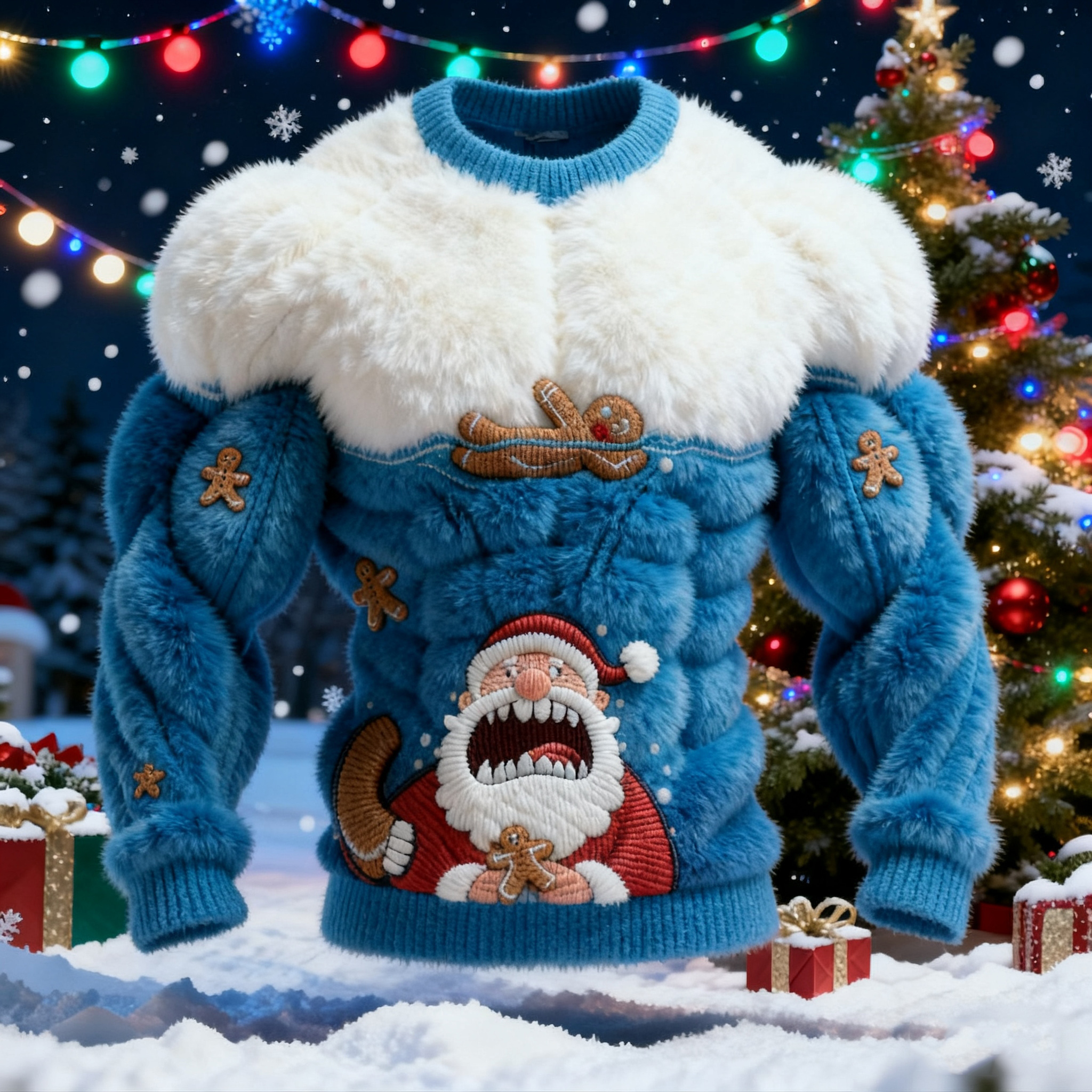 Men's Spoof Santa Claus Eating Gingerbread Pattern Color Blocked Ugly Sweater