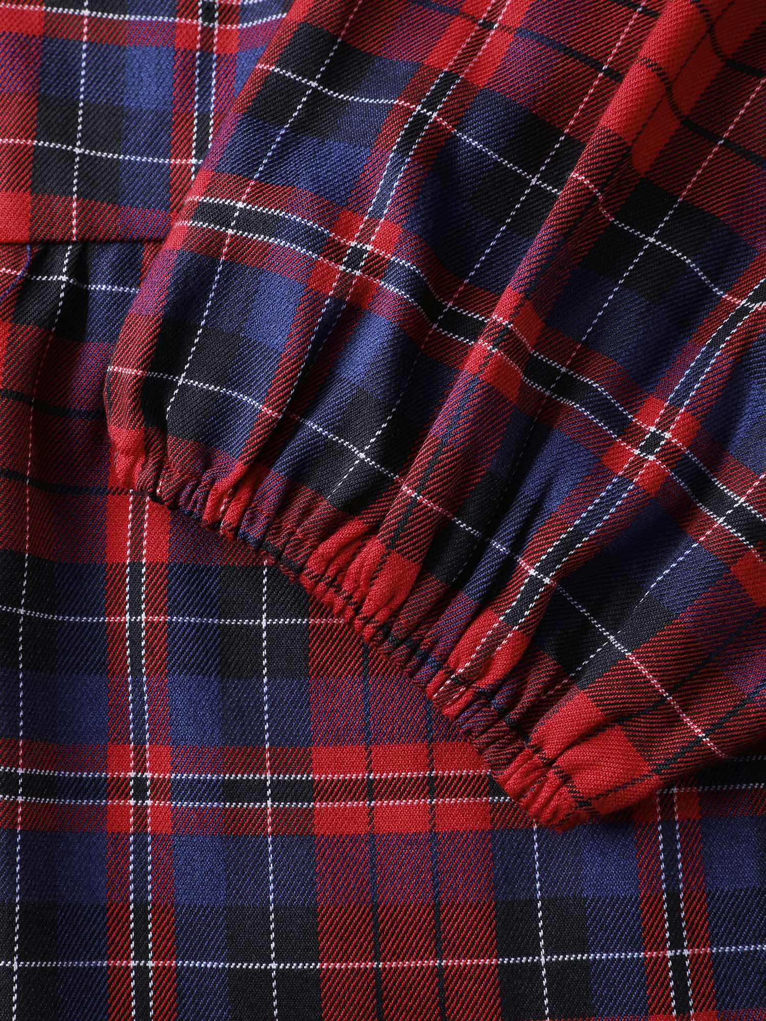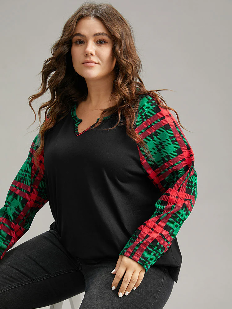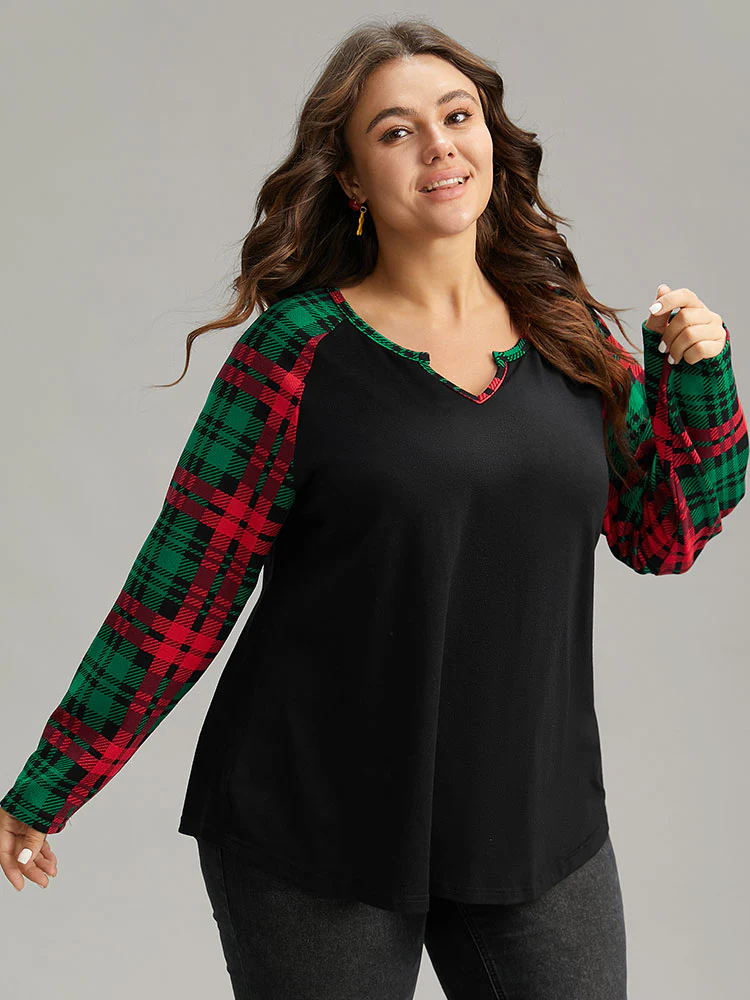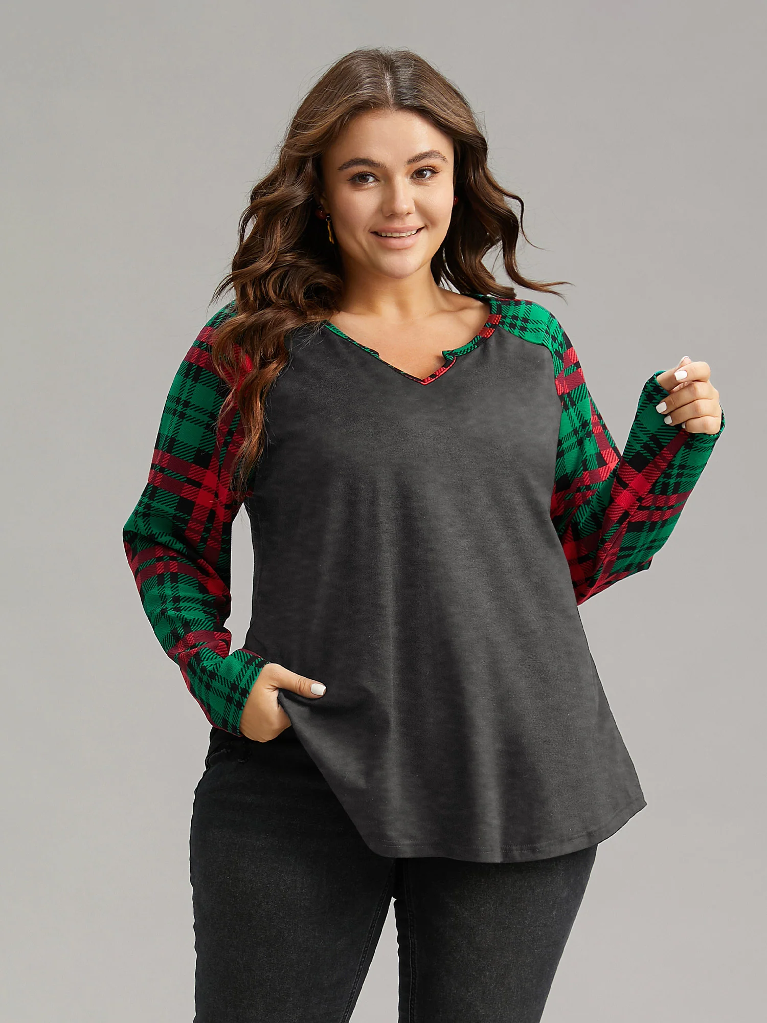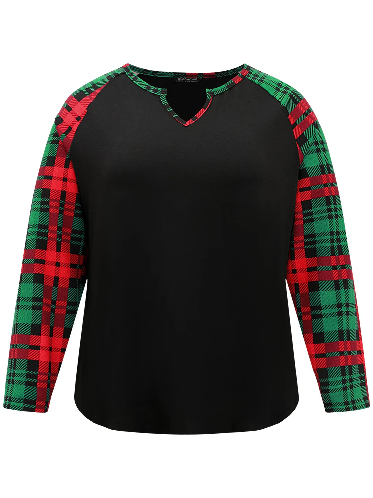 Plaid Contrast Notched Raglan Sleeve T-shirt