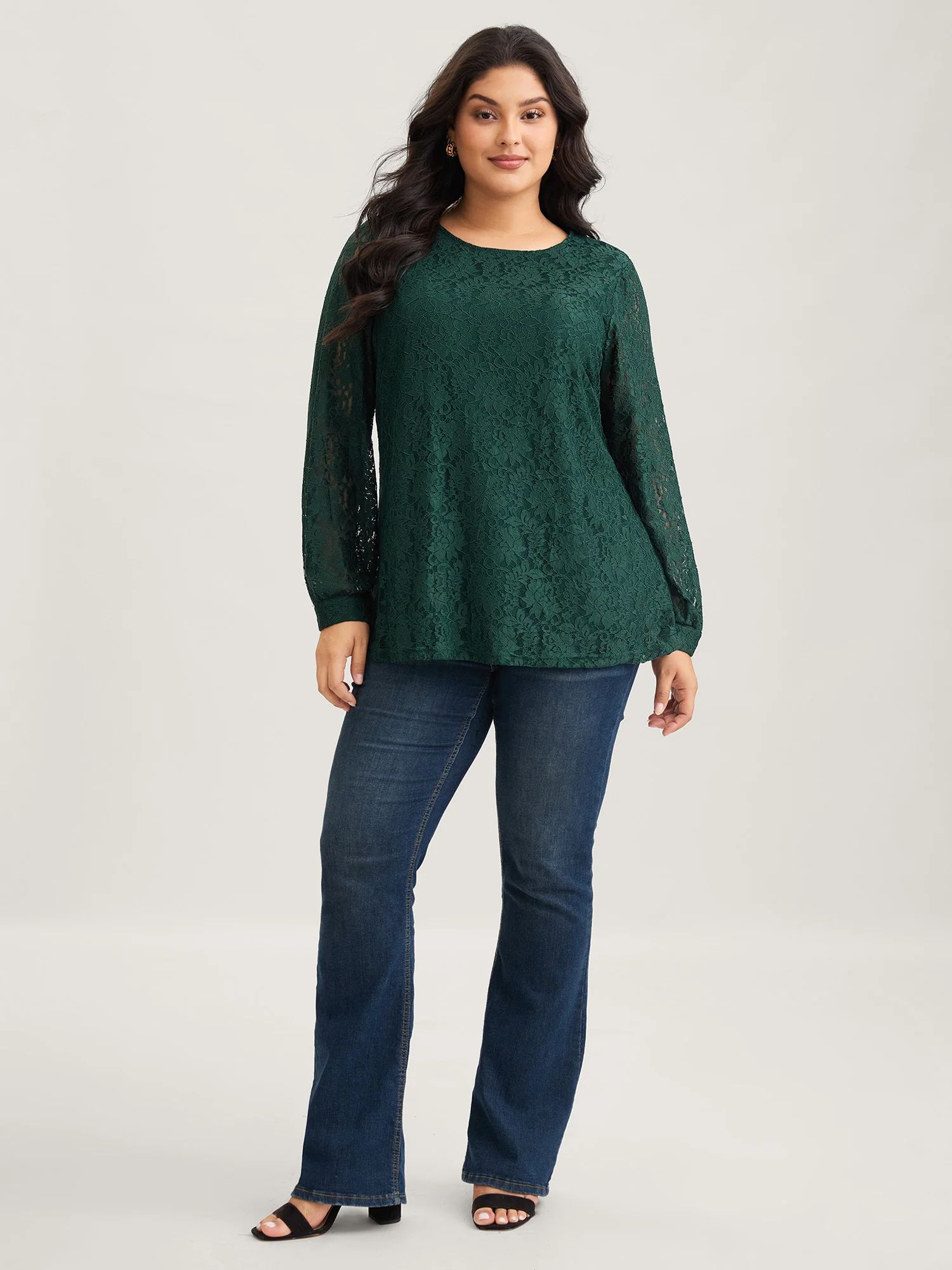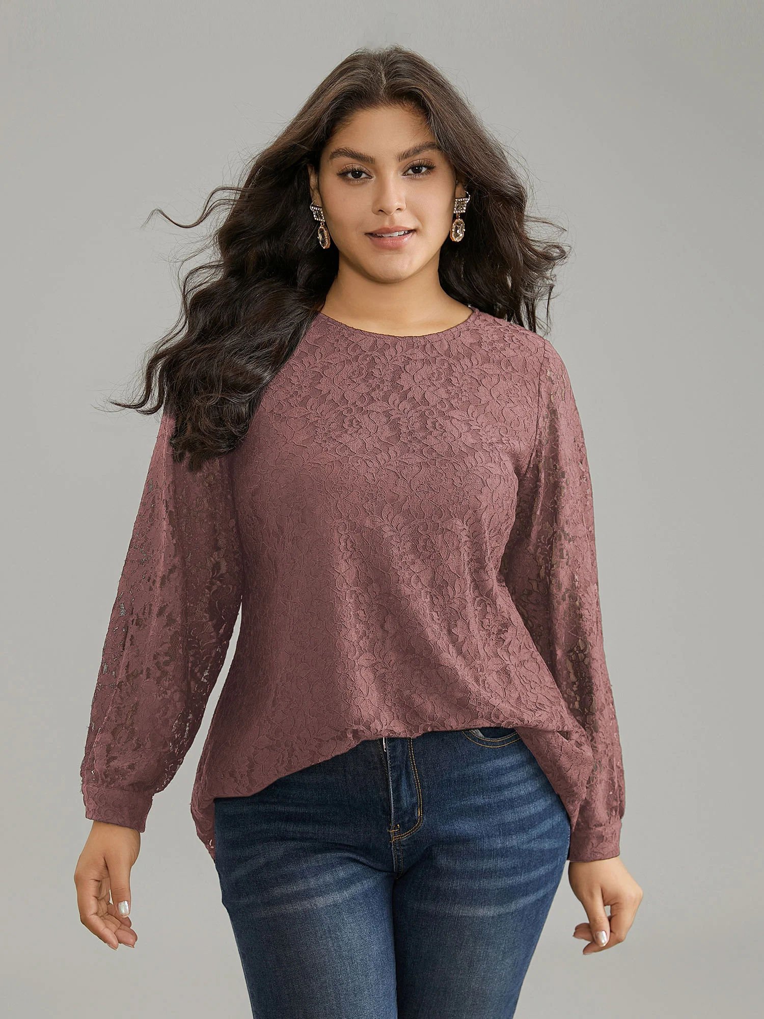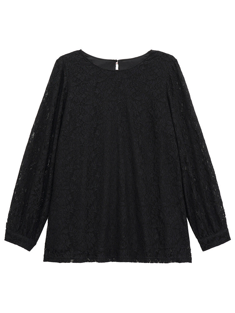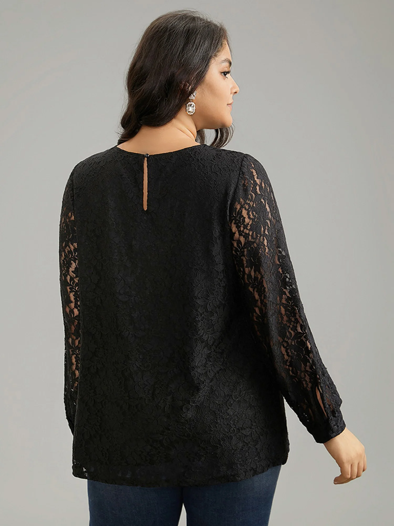 Solid Crochet Lace Mesh Crew Neck Blouse