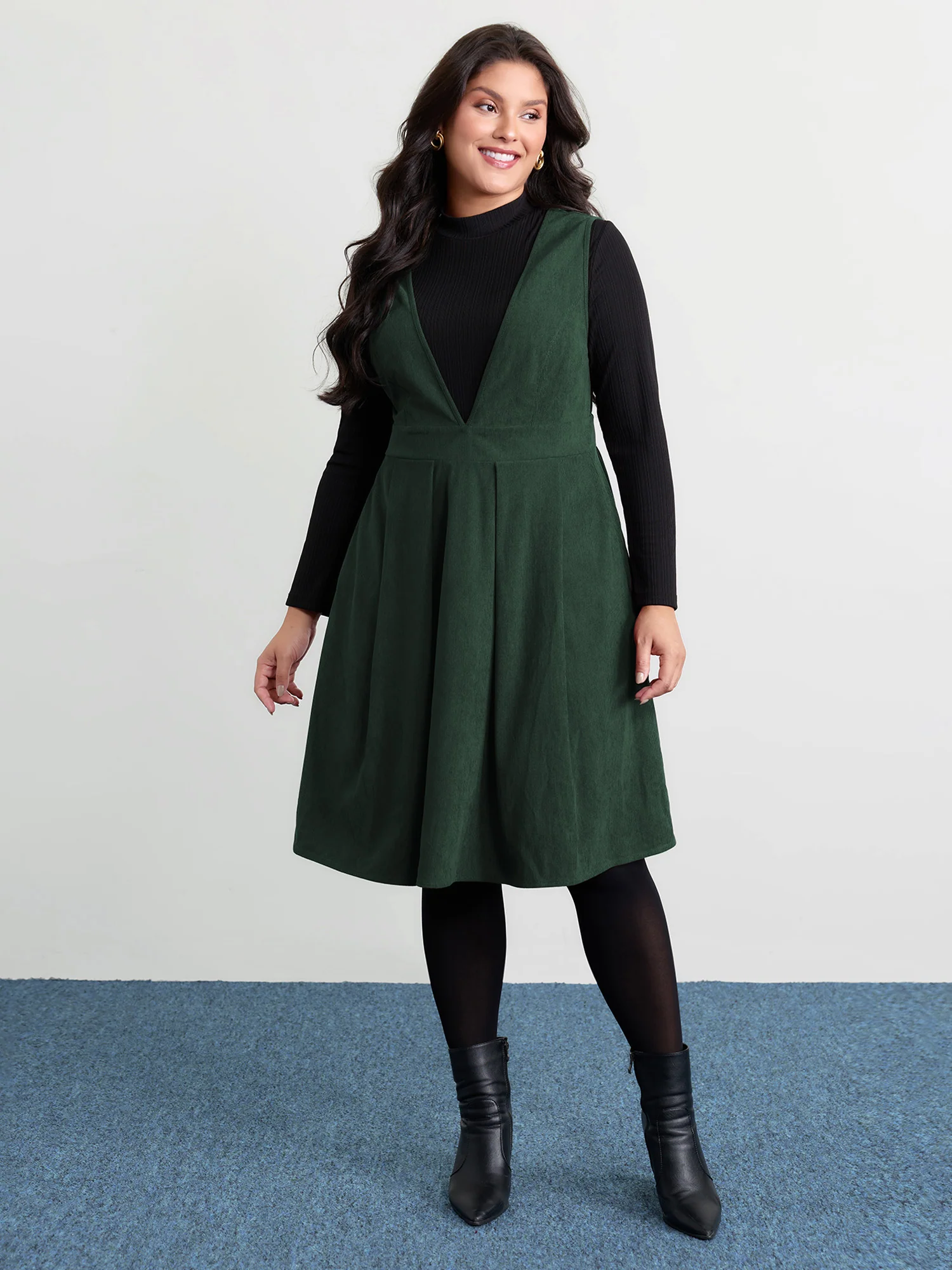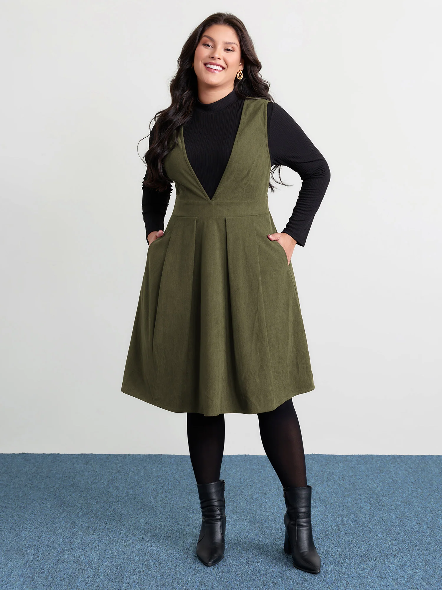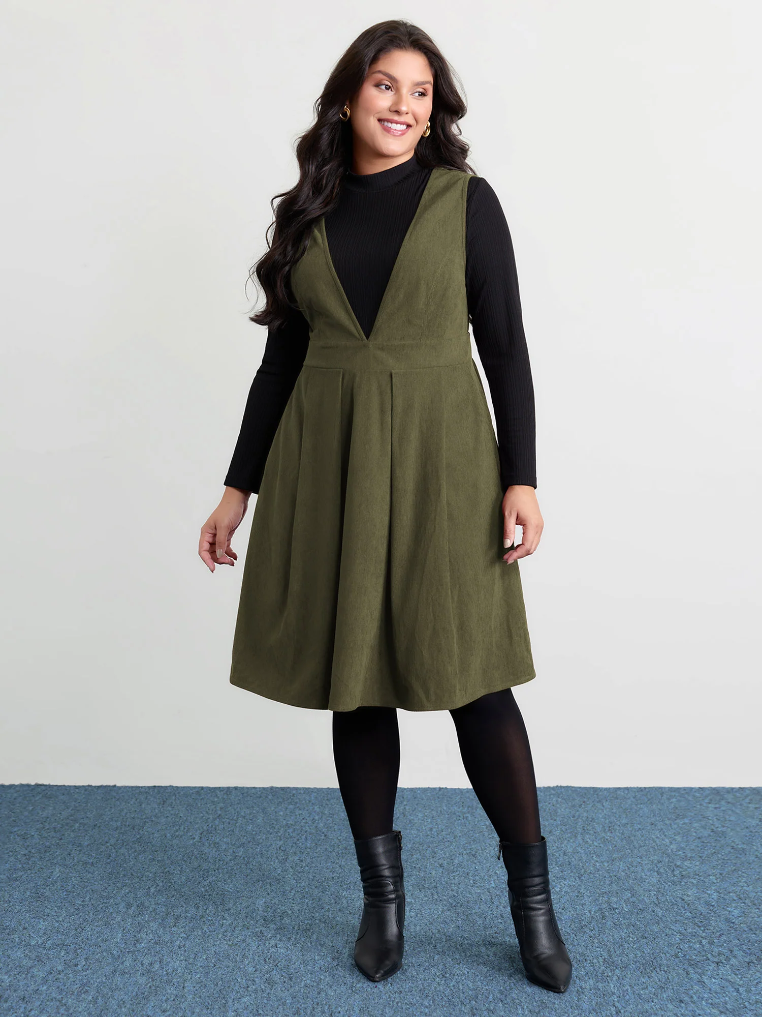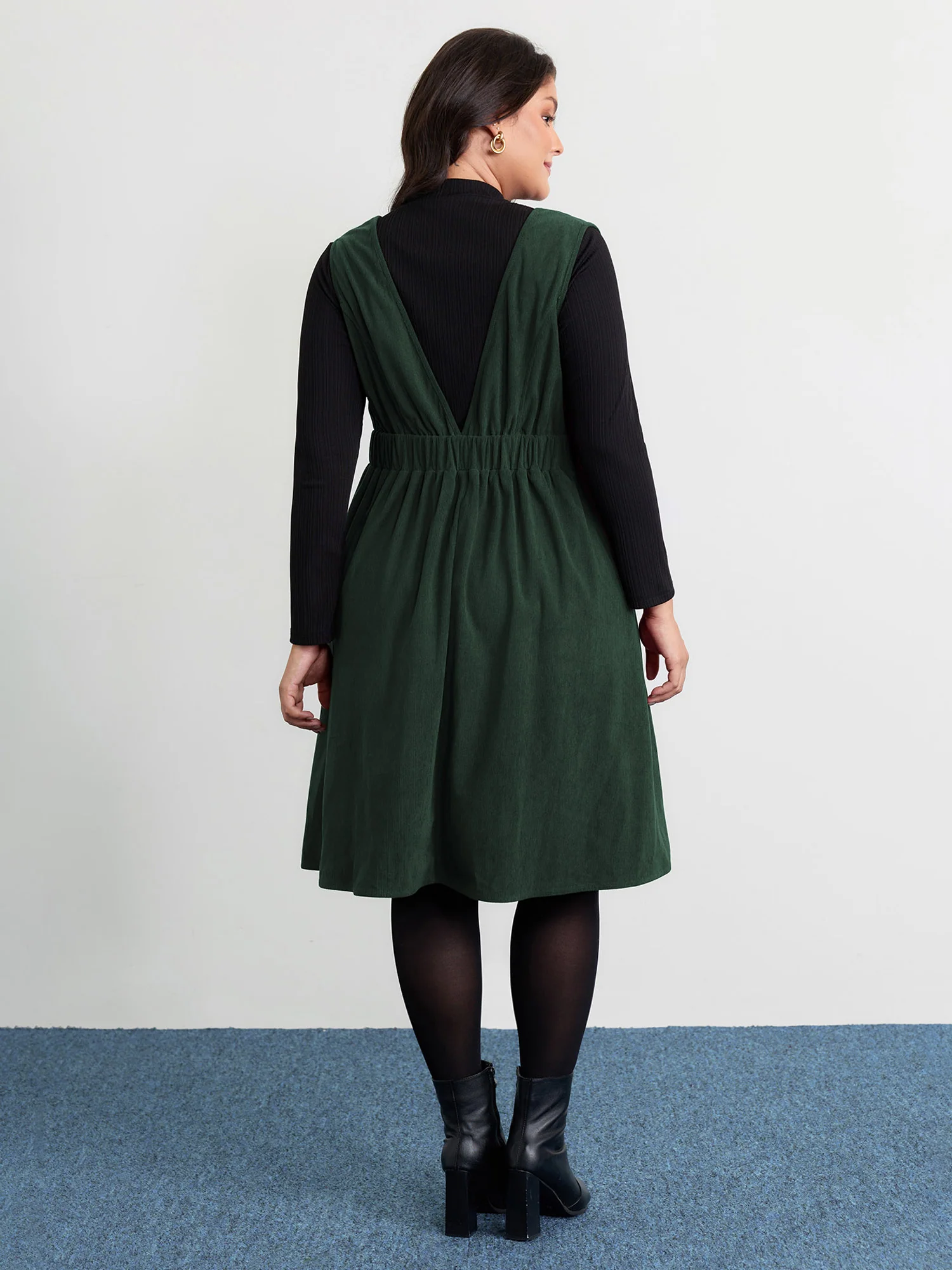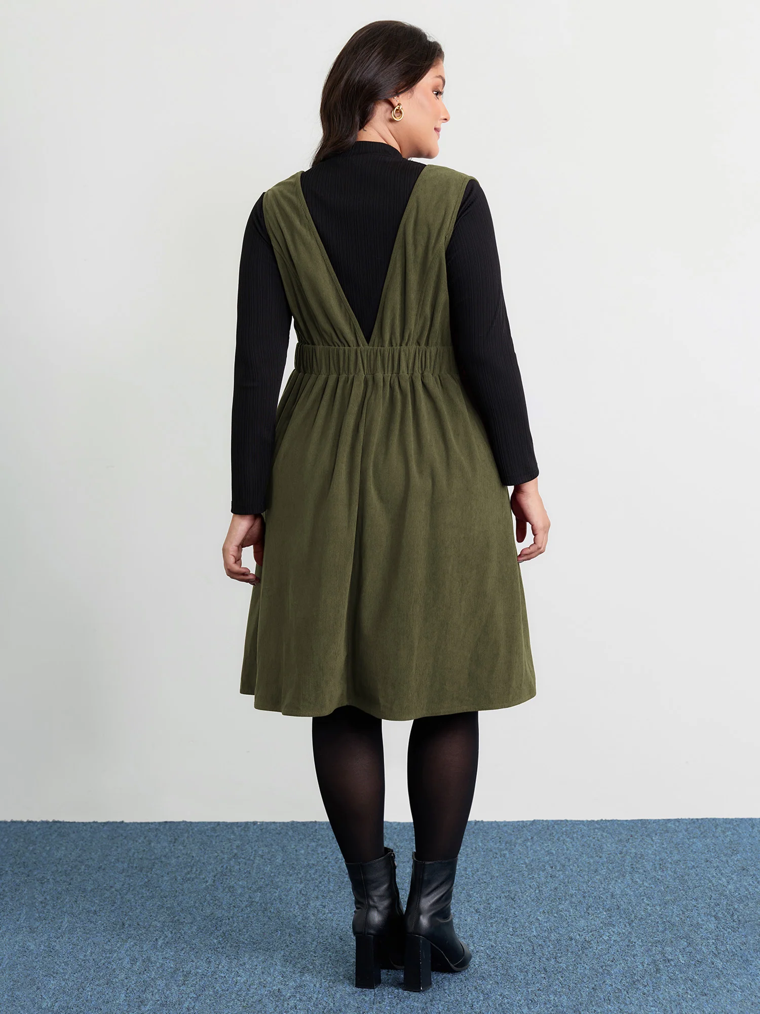 Corduroy Stretchy Waist V-Neck Midi Dress
