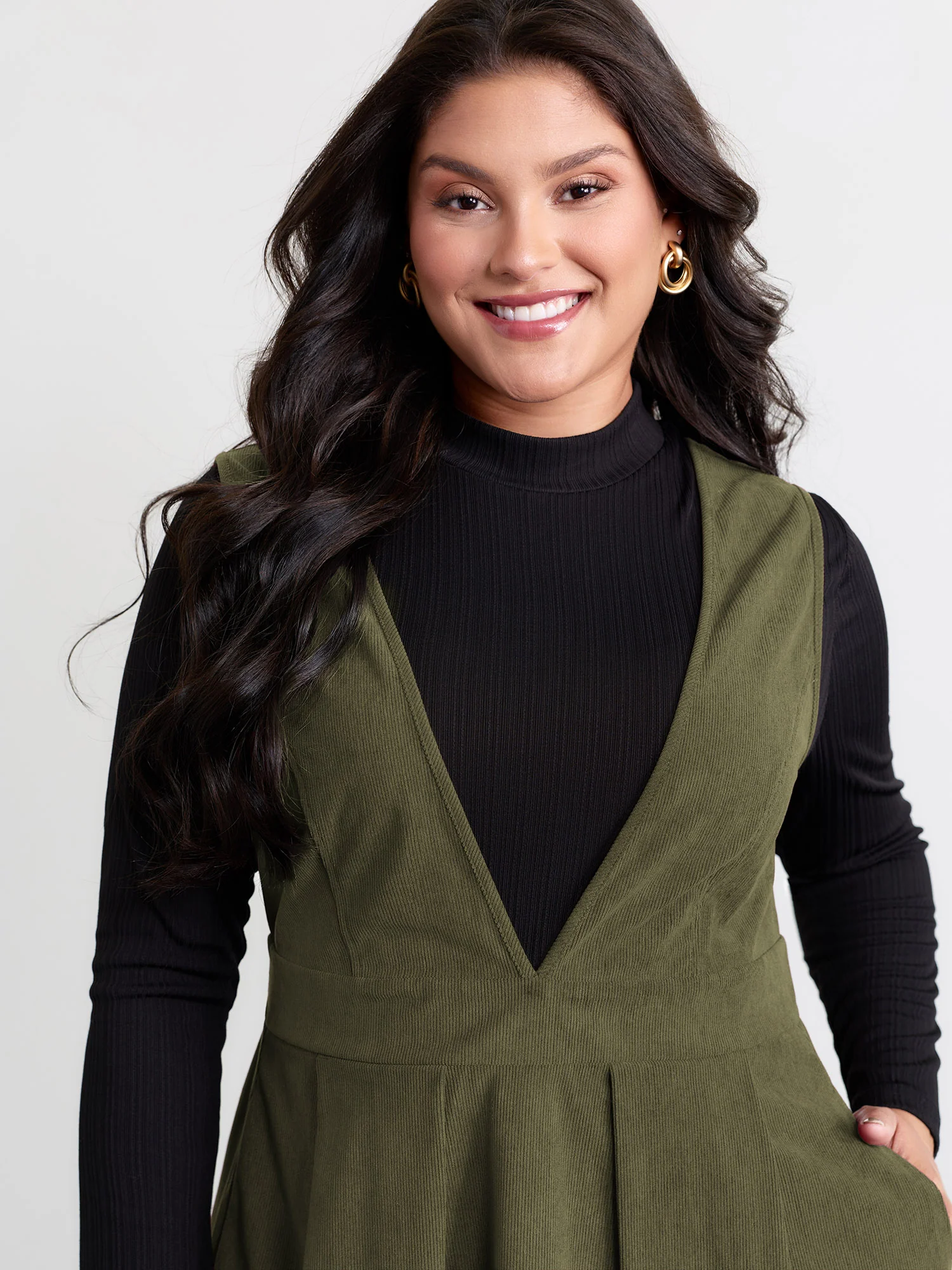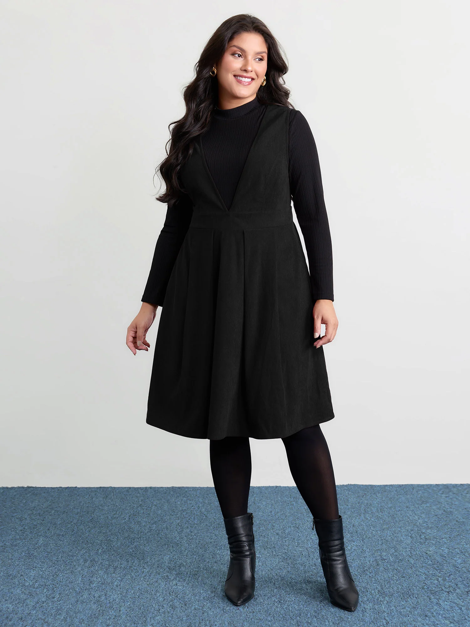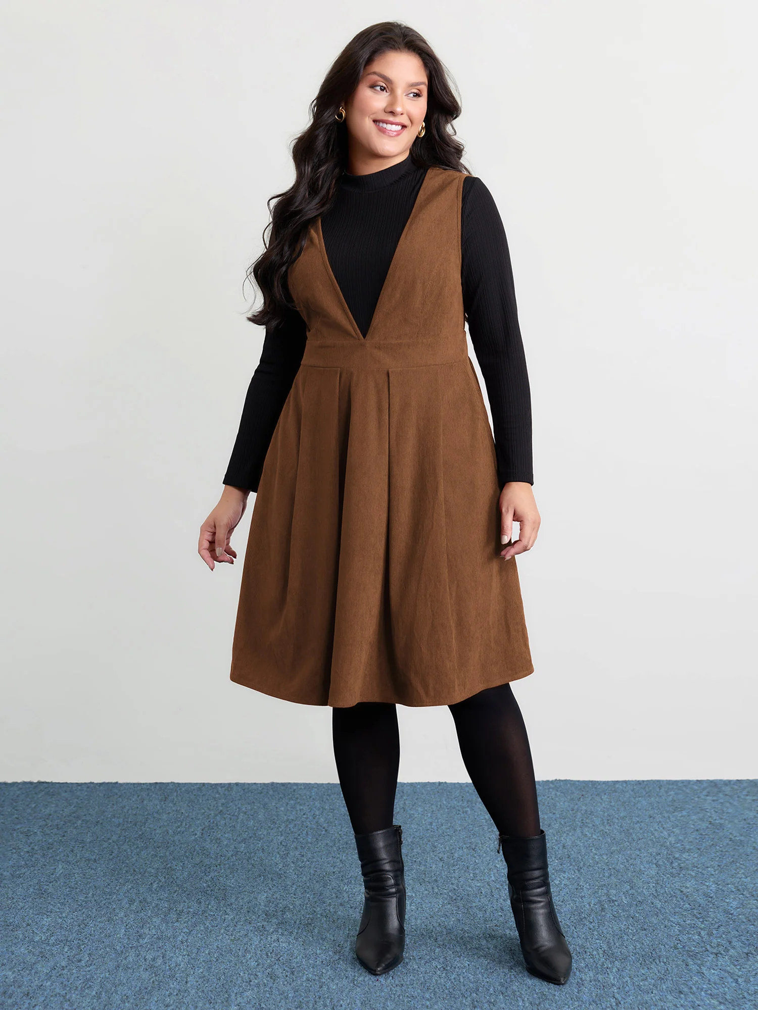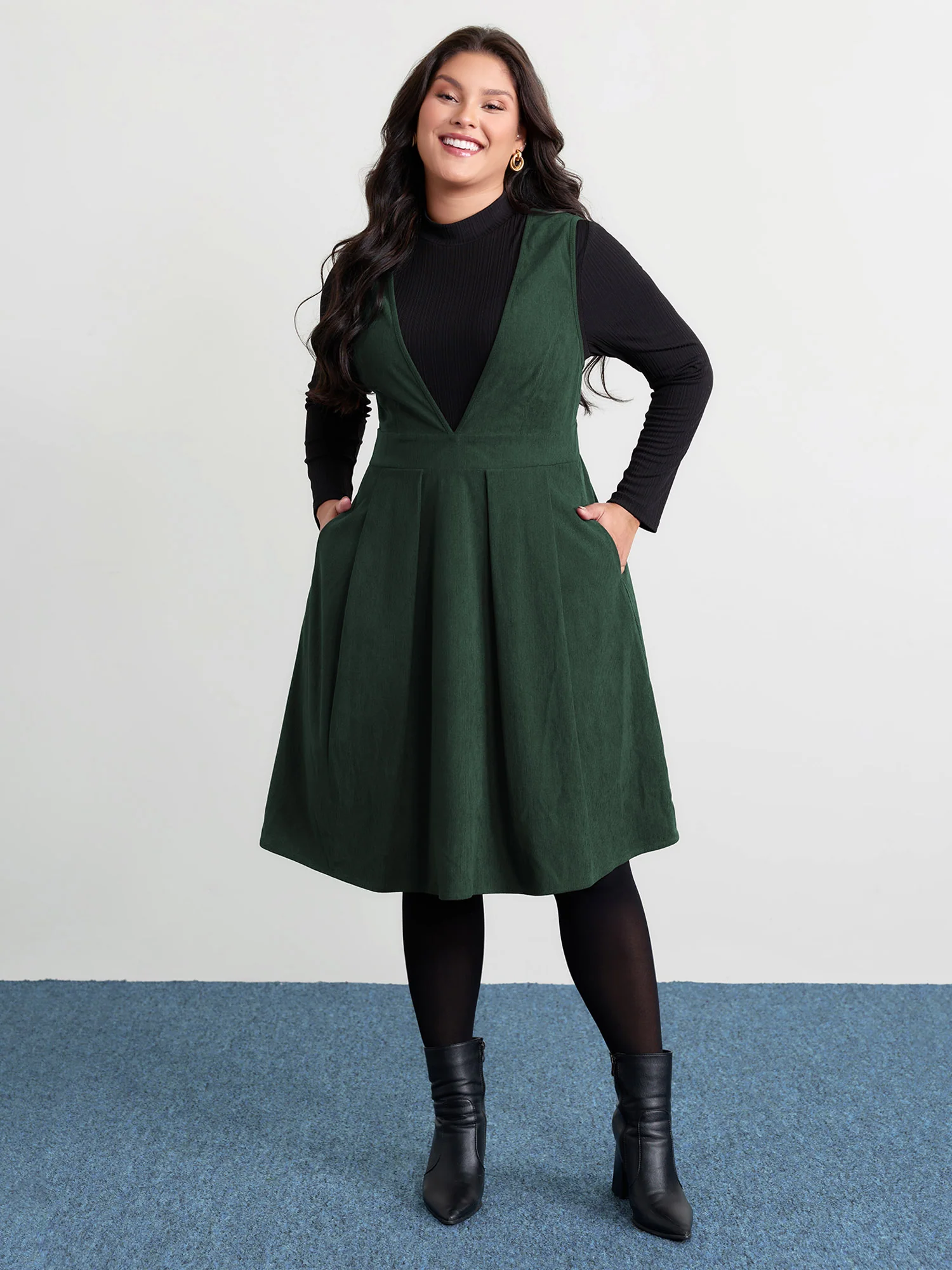 Corduroy Stretchy Waist V-Neck Midi Dress