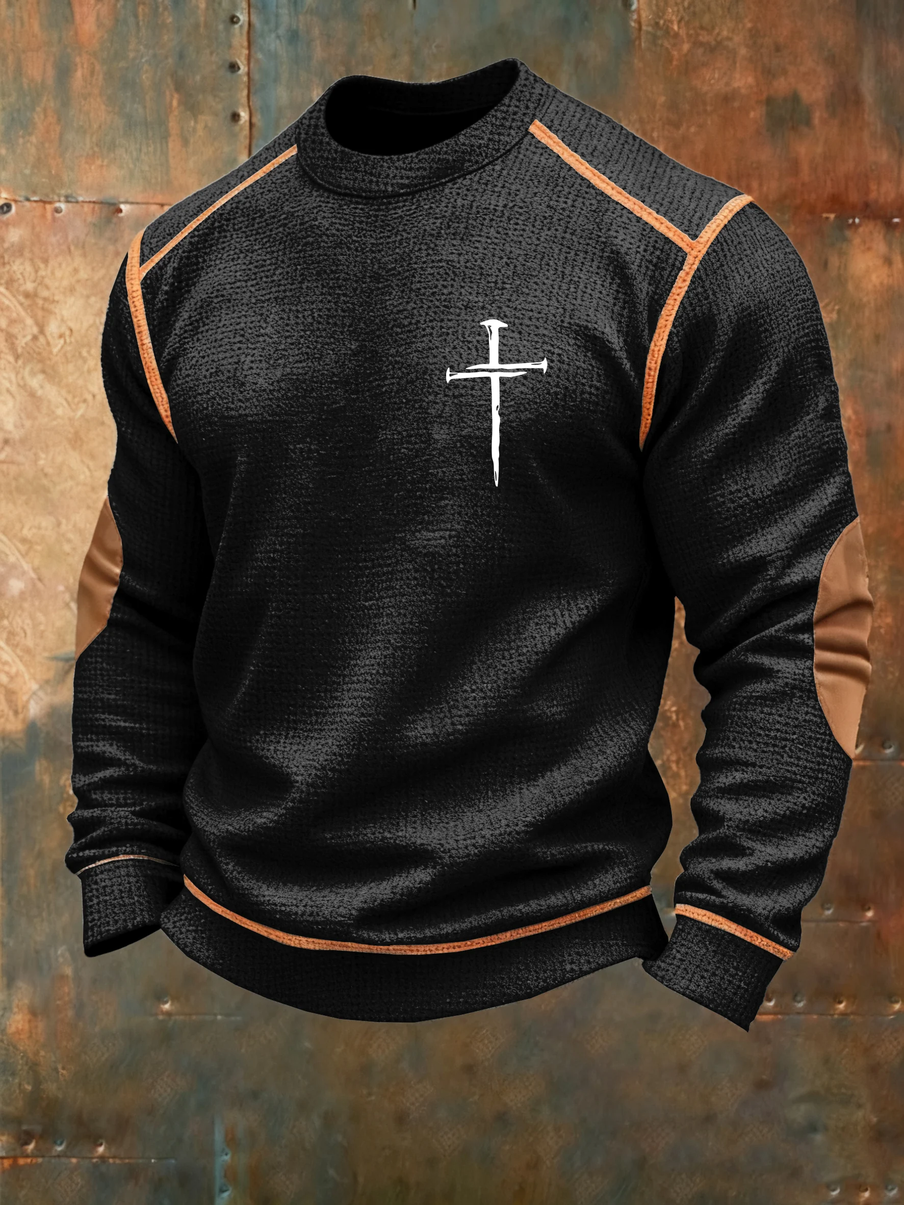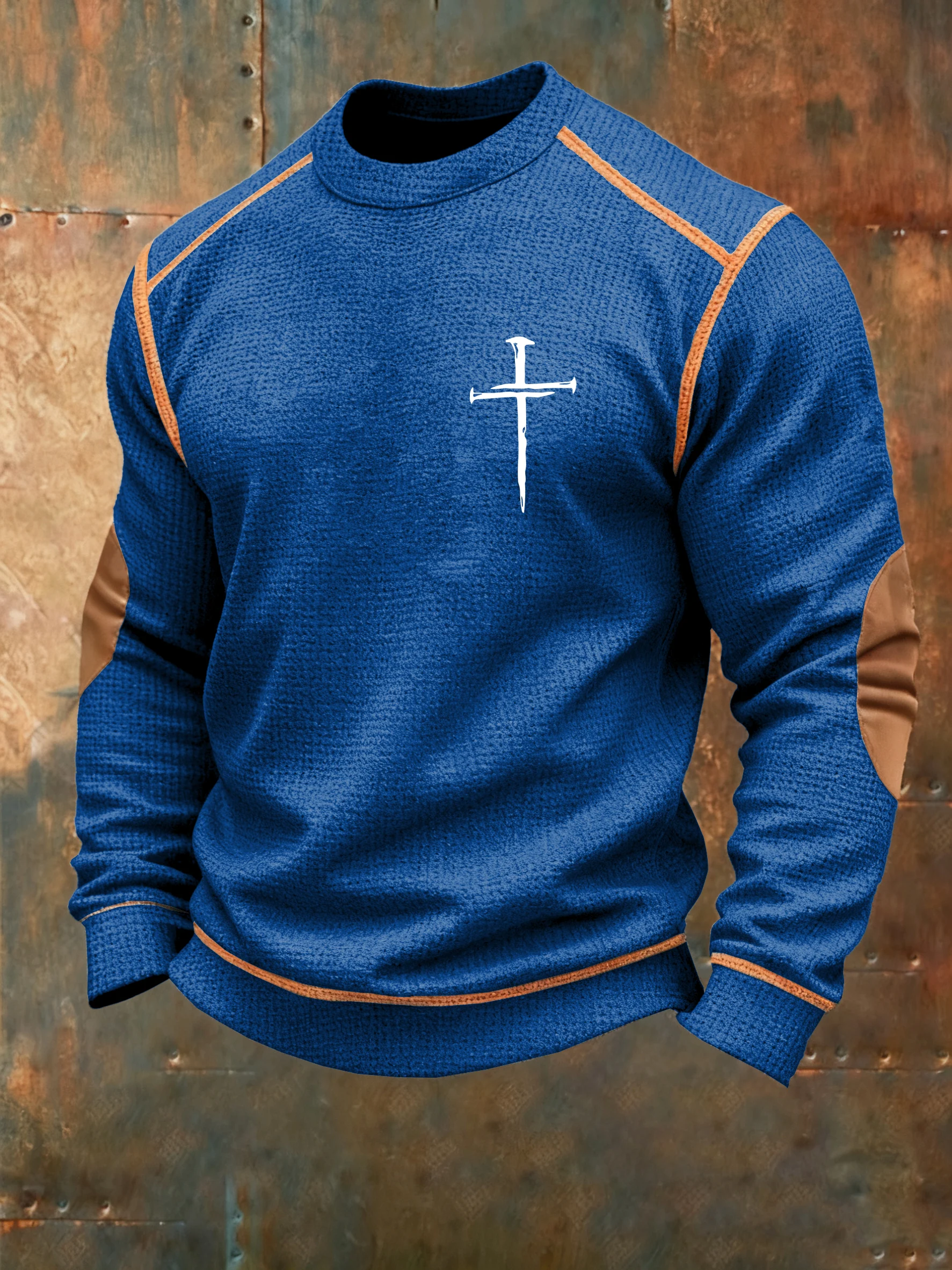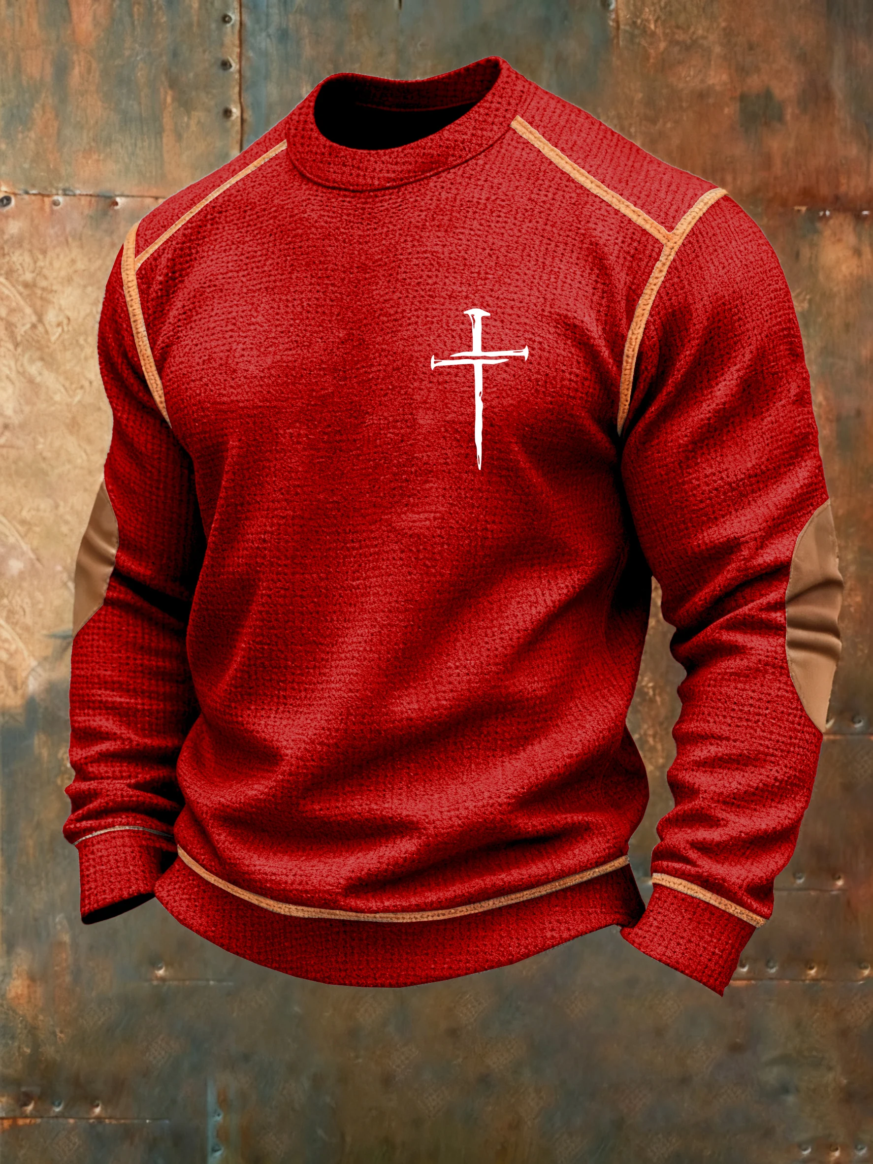 Men's Vintage Faith Cross Print Waffle Crew Neck Sweatshirt
