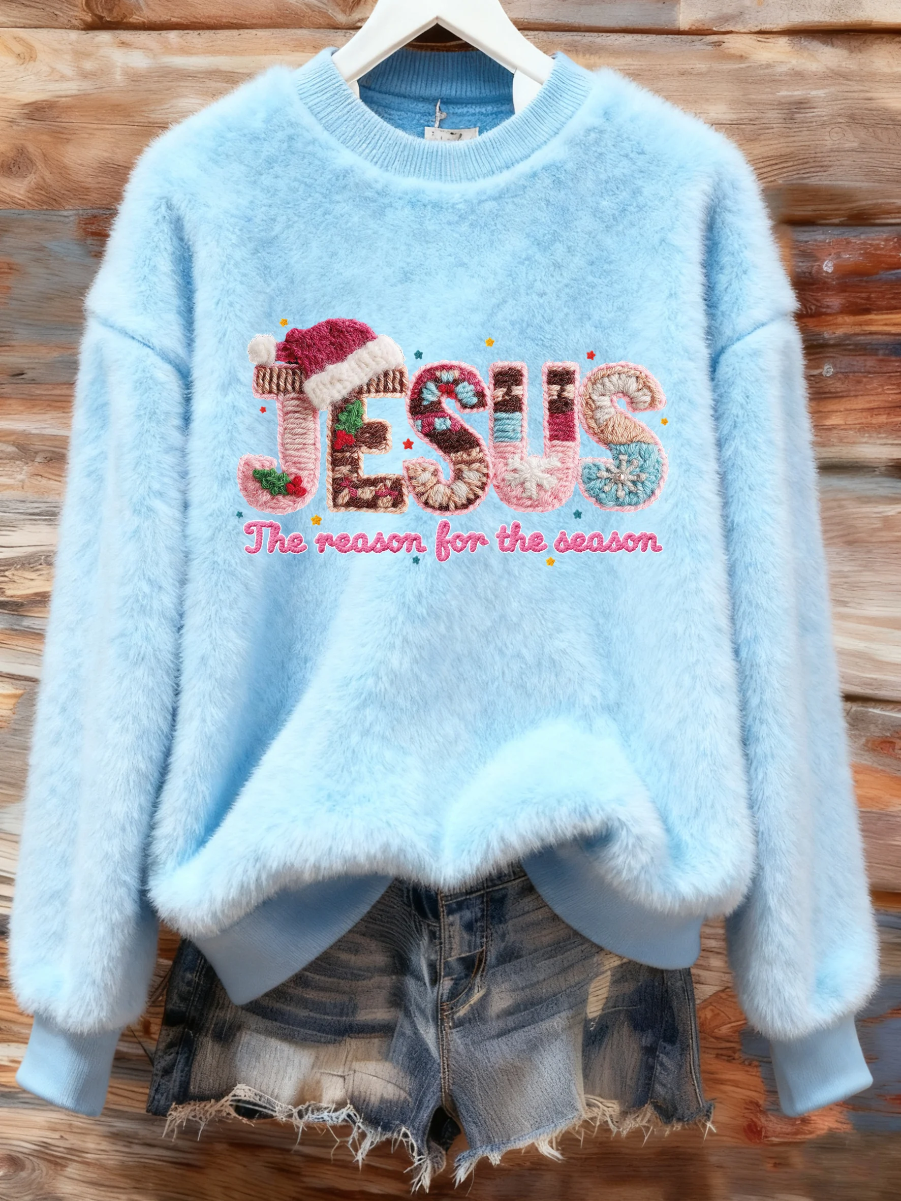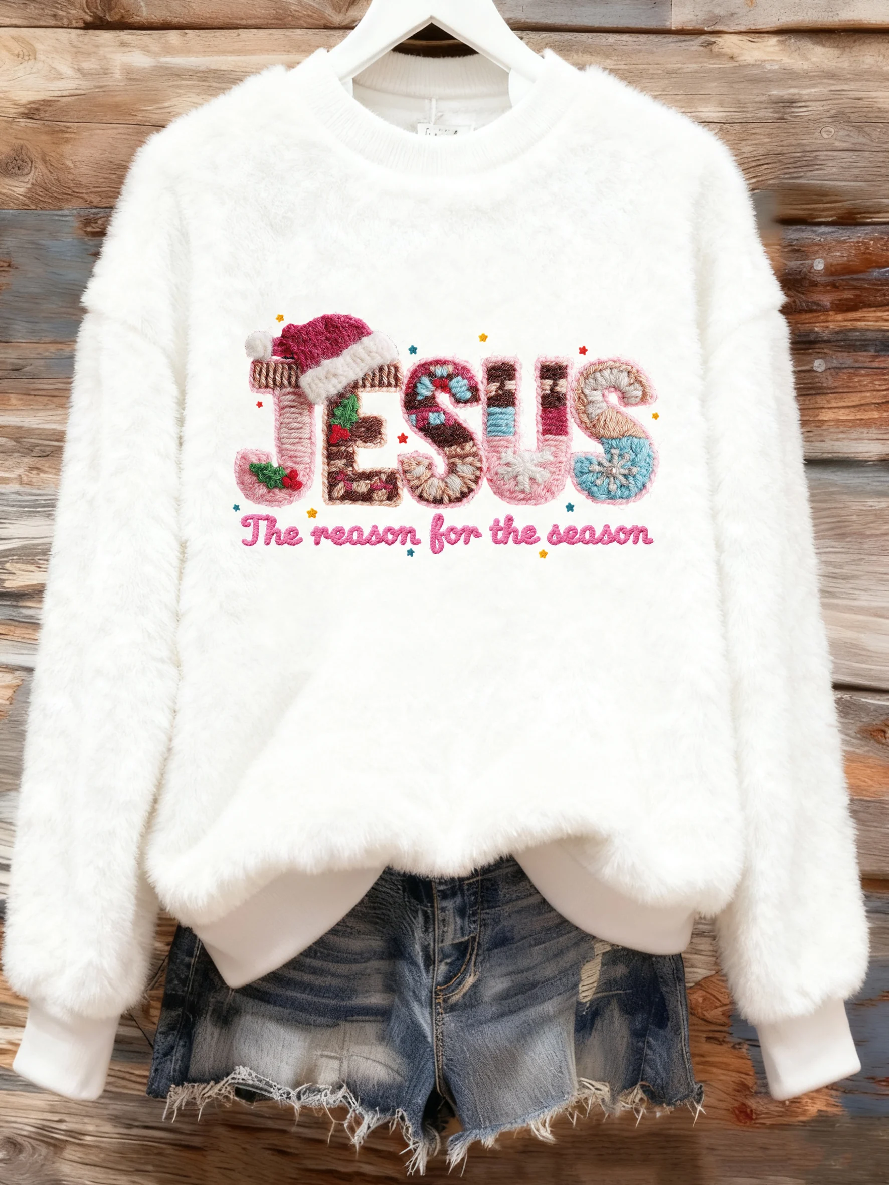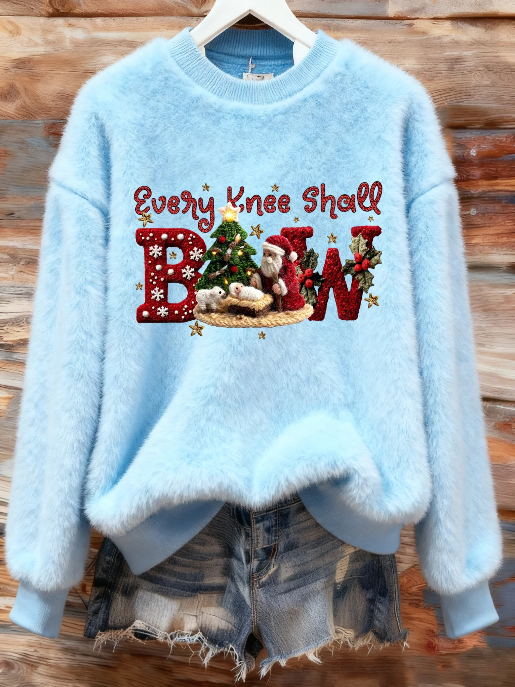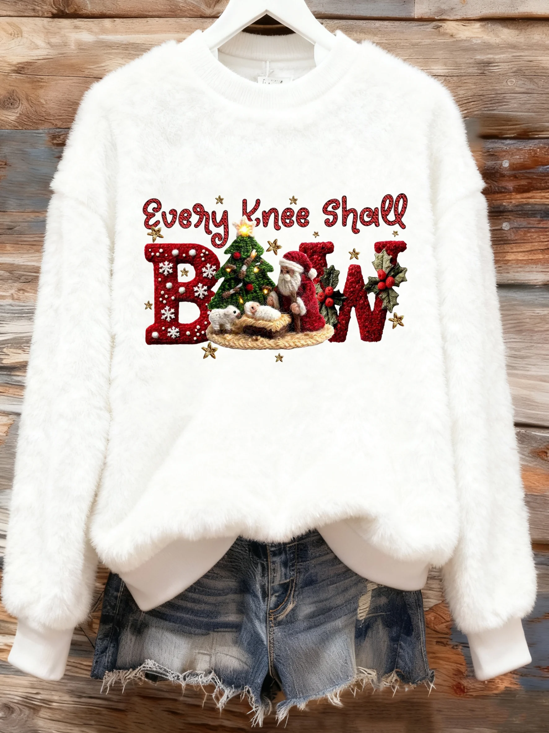 Women's Winter Christmas Cross Printed Crew Neck Furry Top