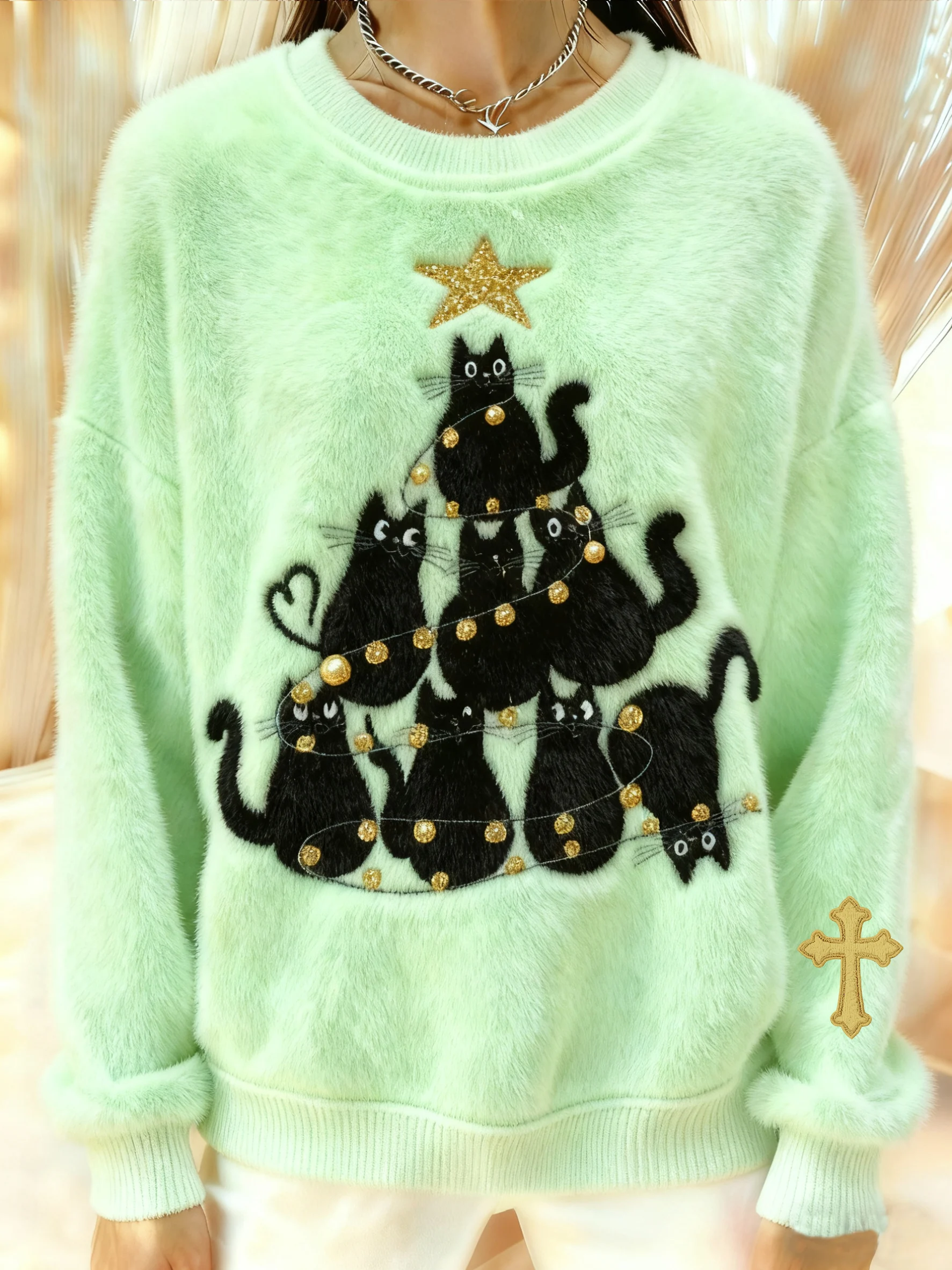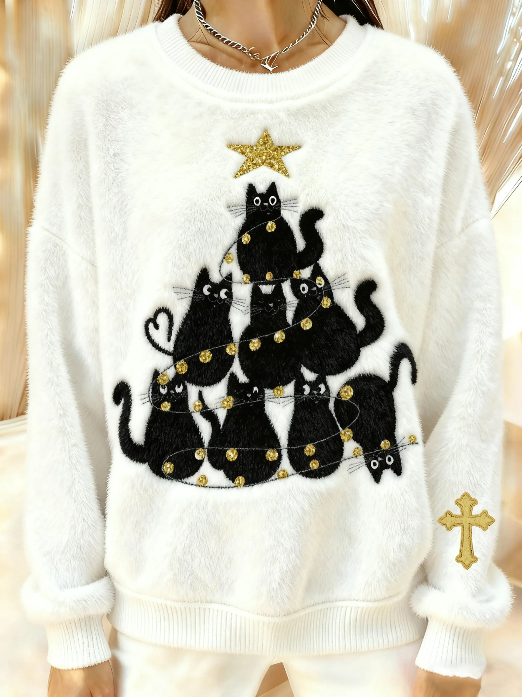 Women's Winter Christmas Cross Print Plush Crew Neck Top