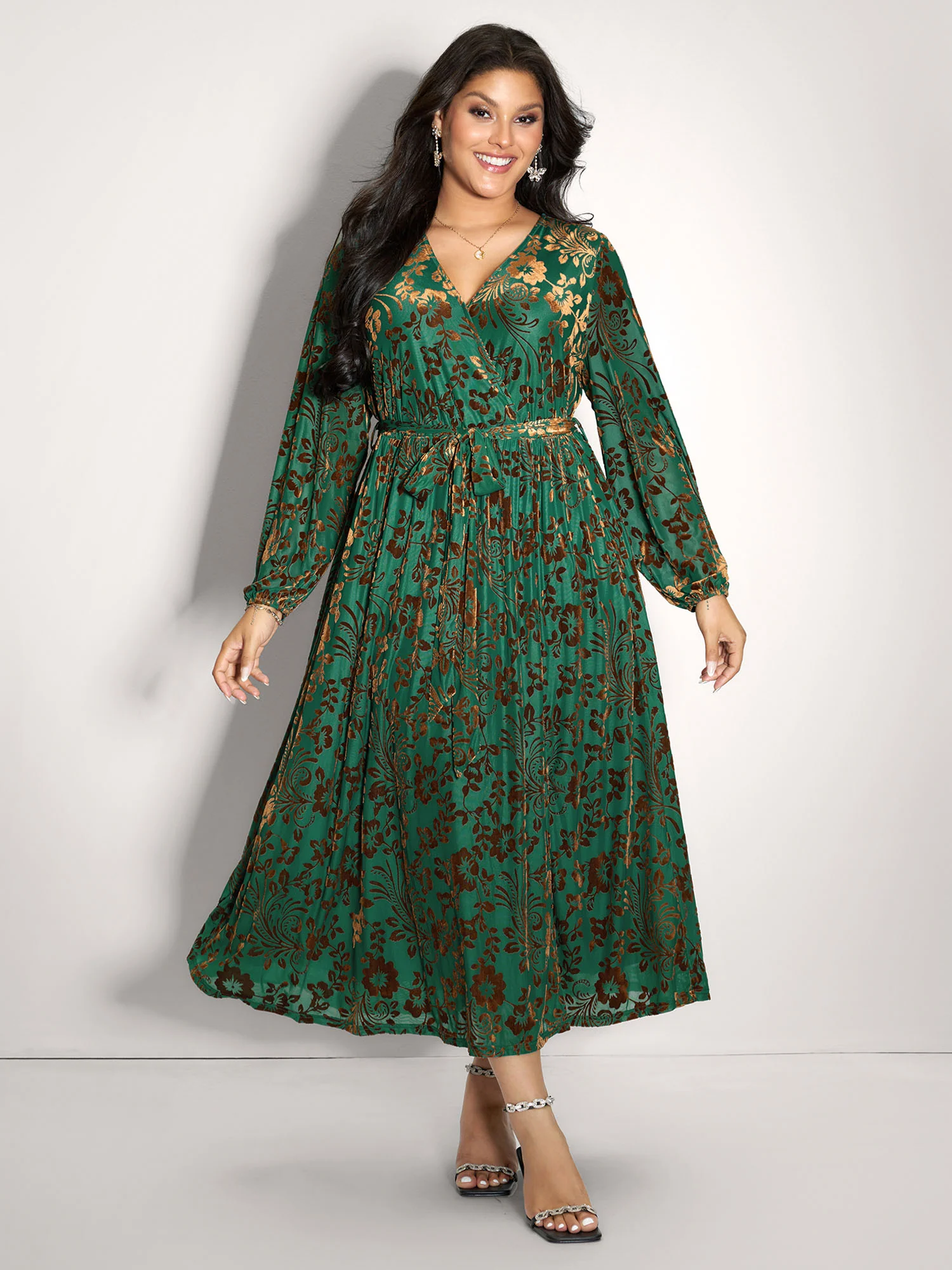 Gold Stamp Lantern Sleeve Ruffled Midi Dress
