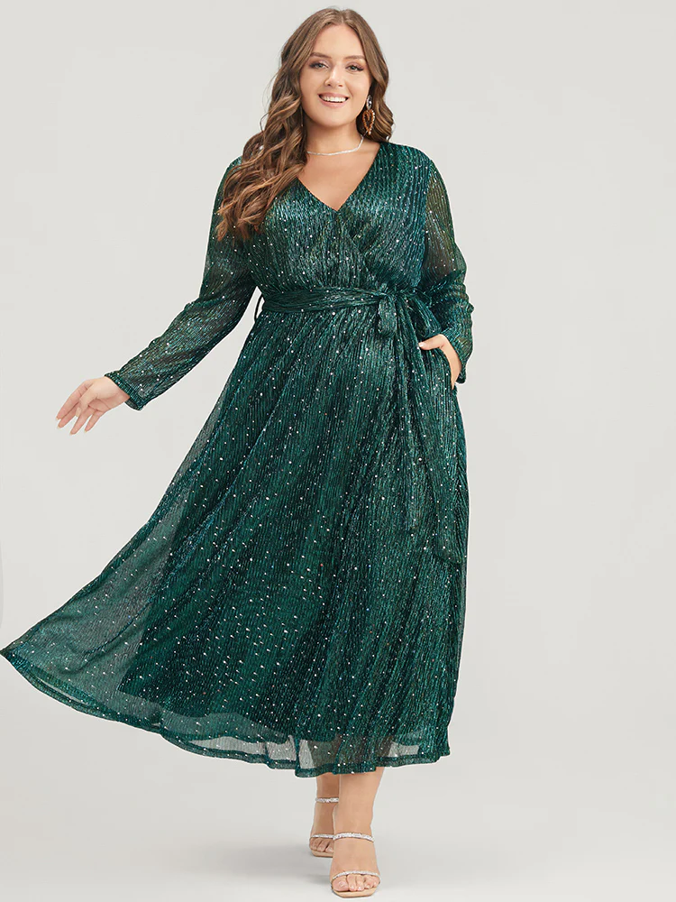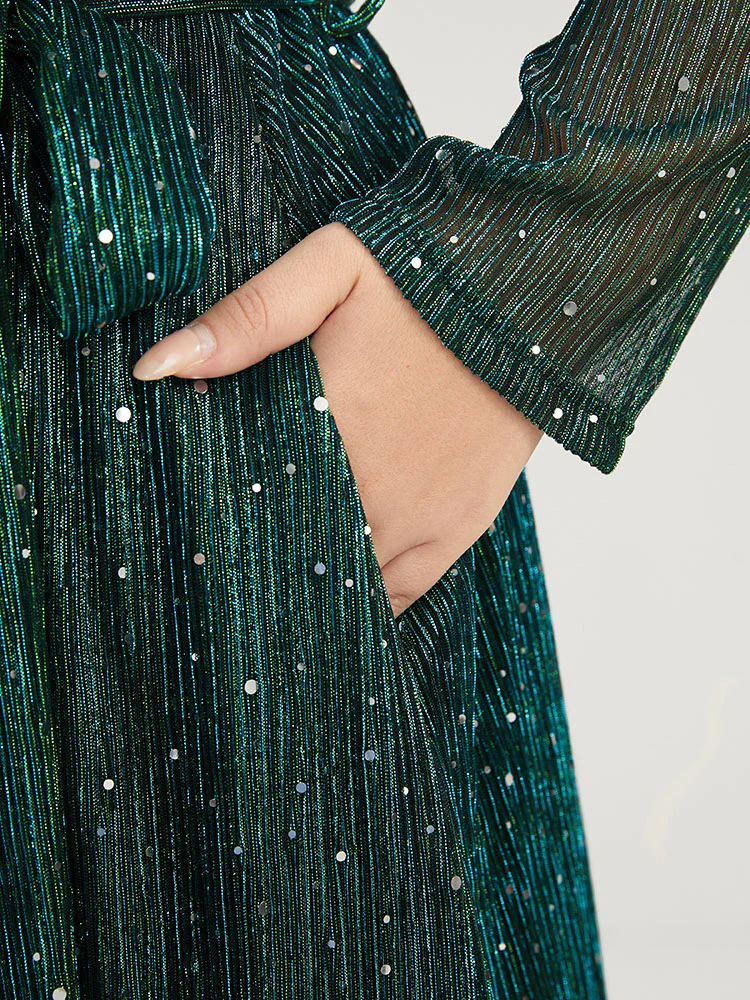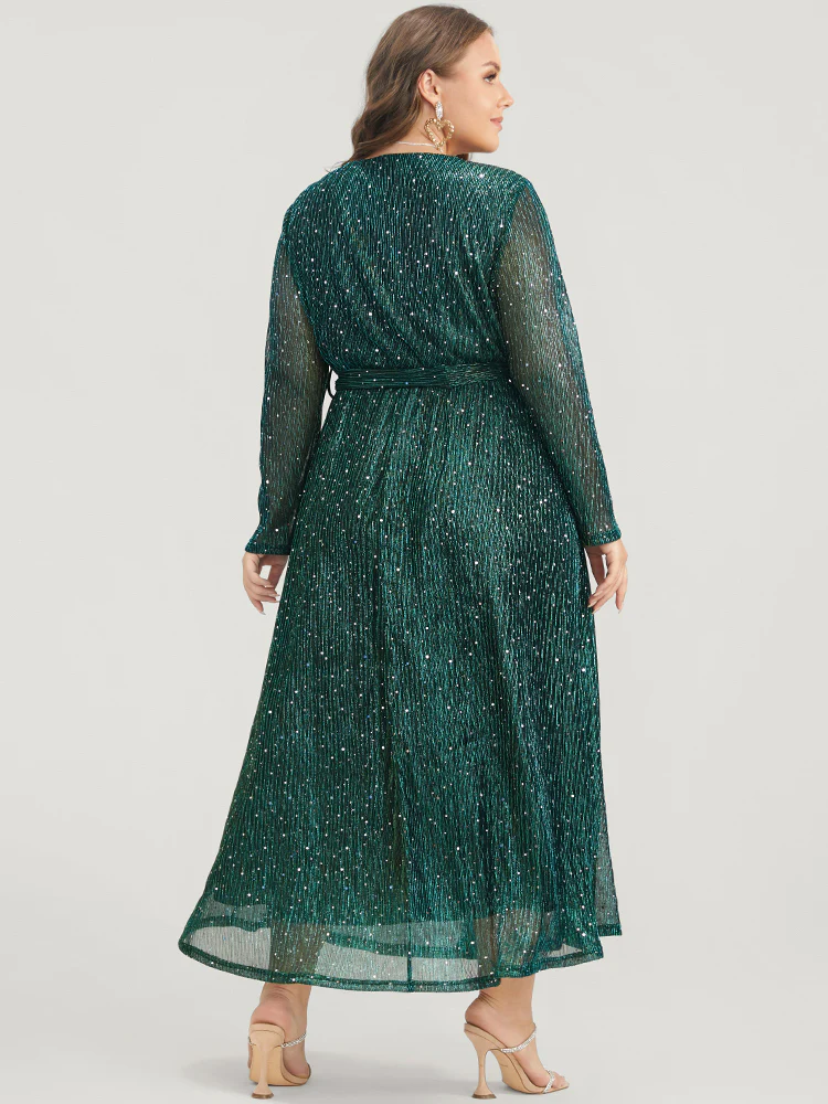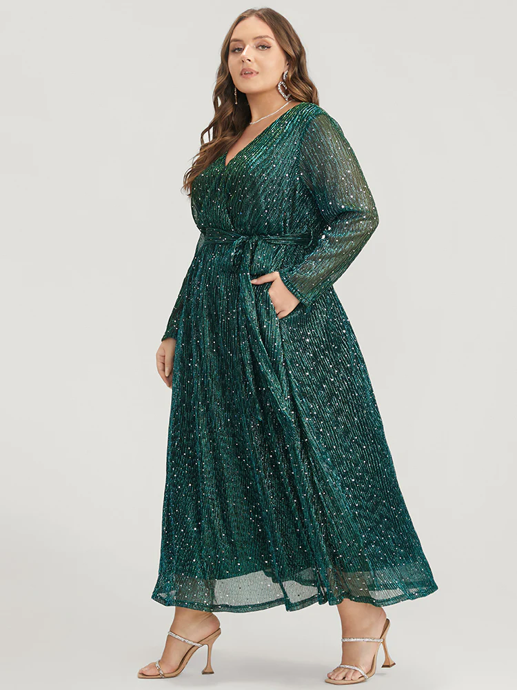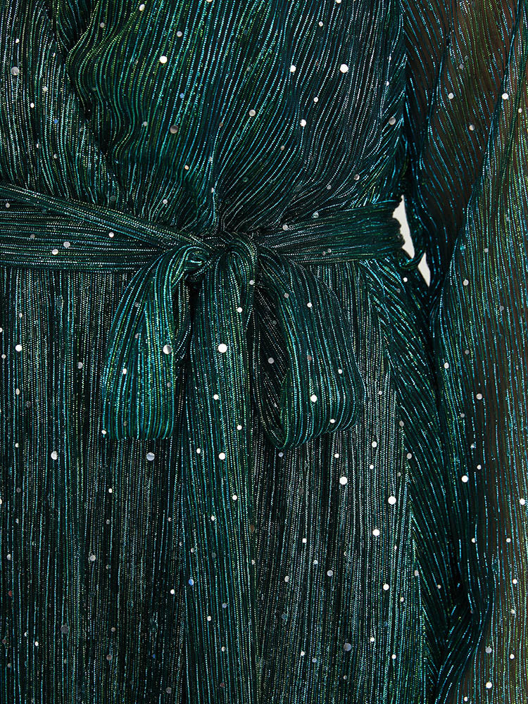 Solid Pocket Wrap Belted Sequin Mesh Maxi Dress