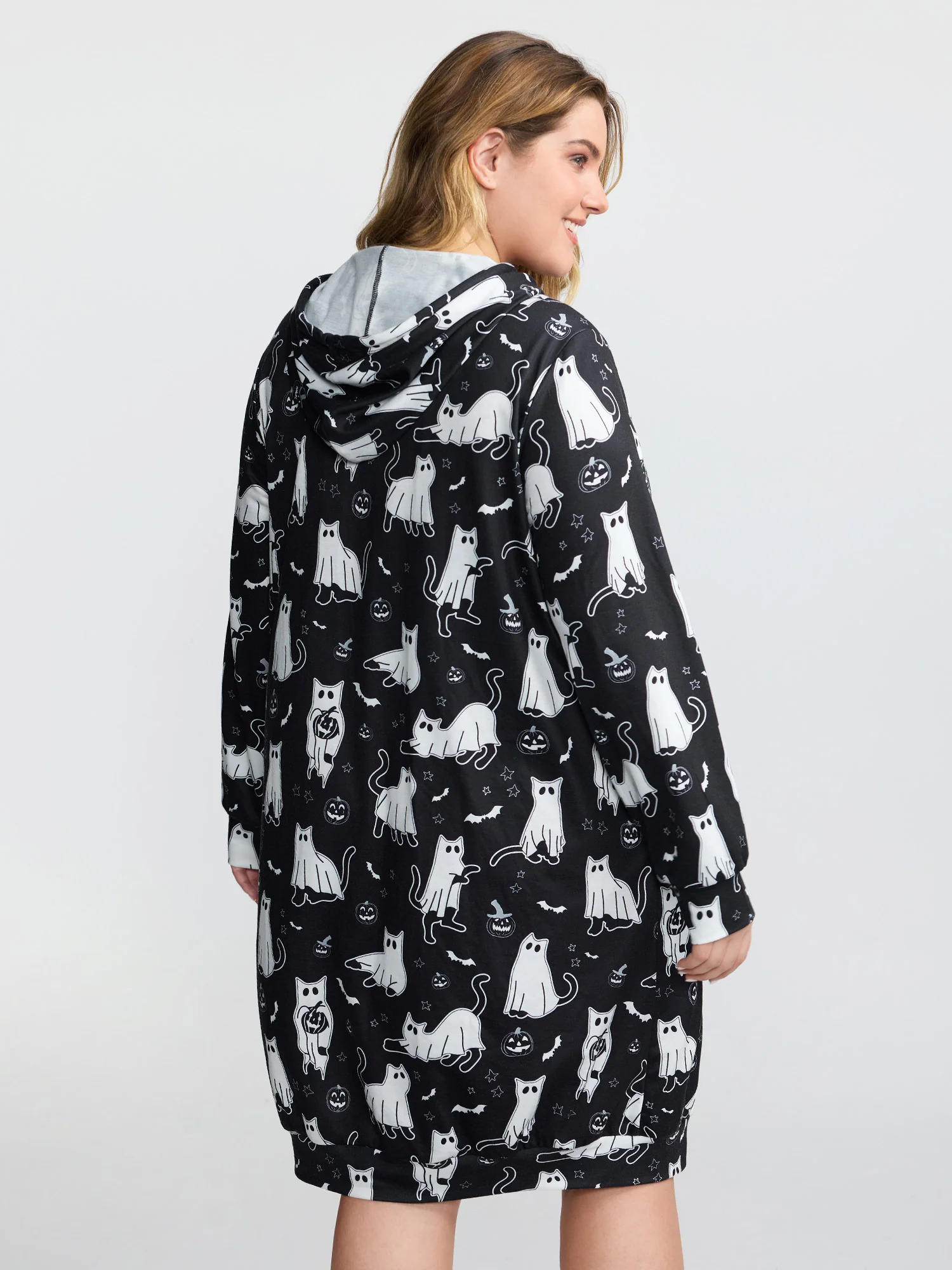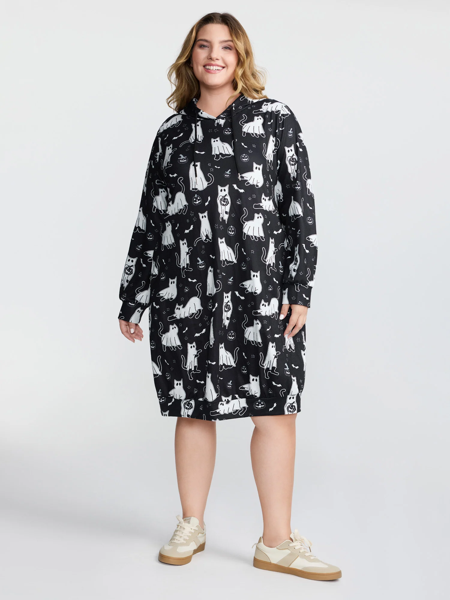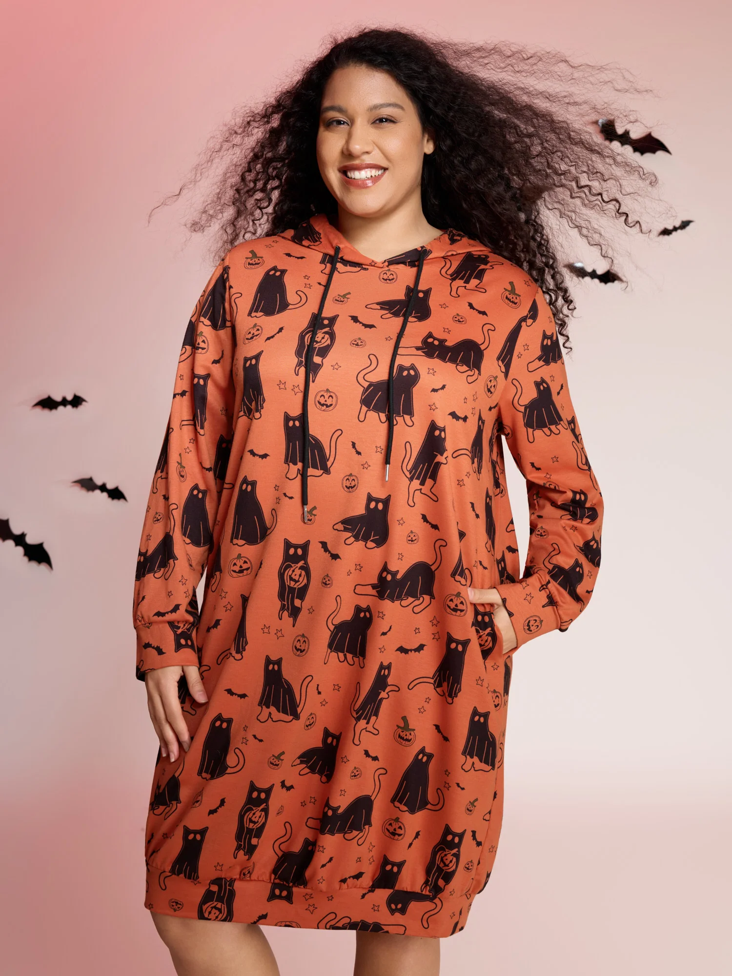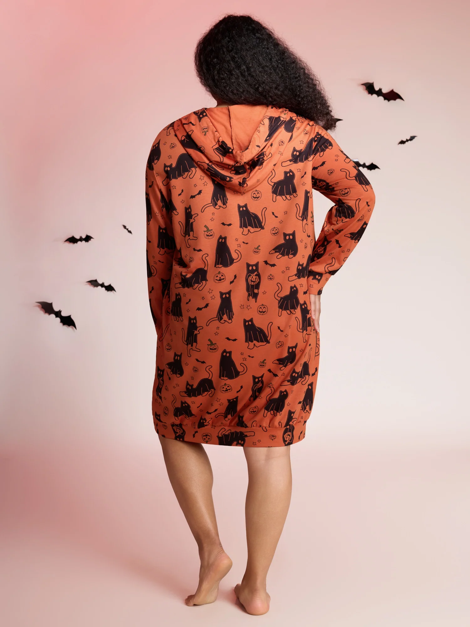 Pumpkin Cat Printed Hooded Midi Dress