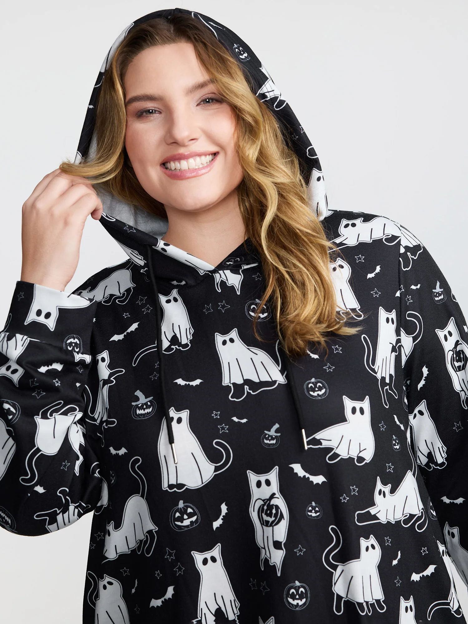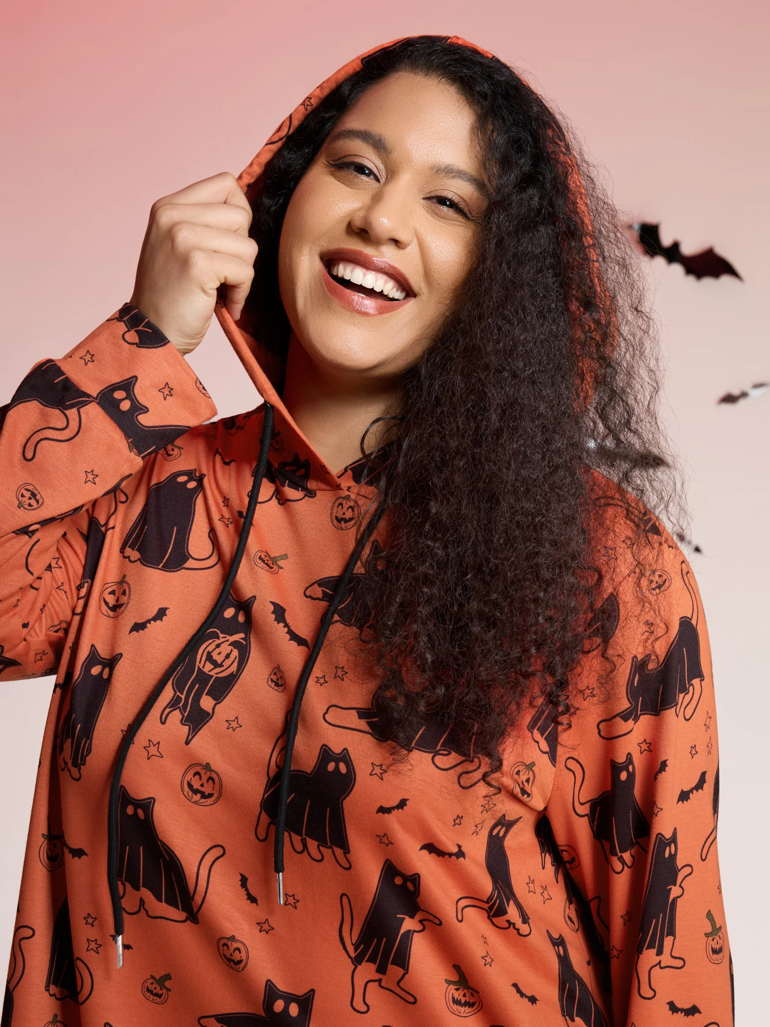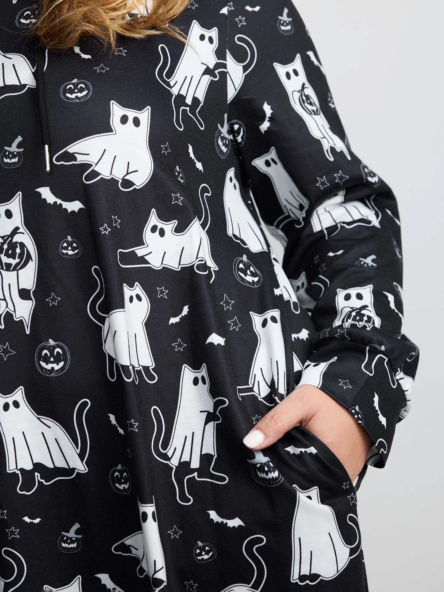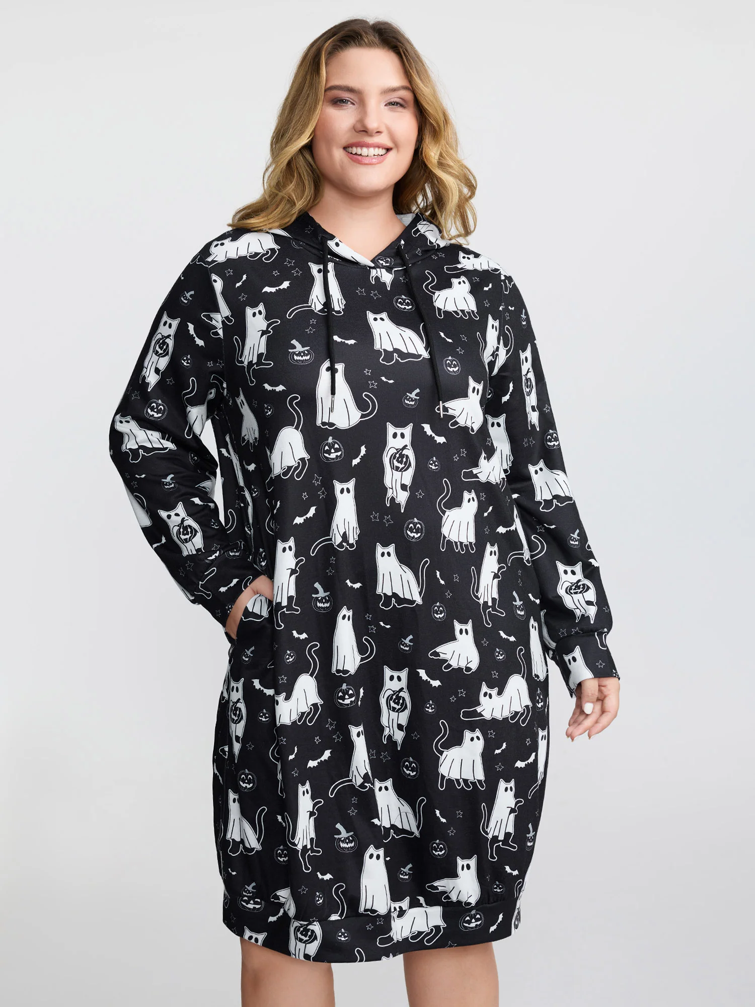 Pumpkin Cat Printed Hooded Midi Dress