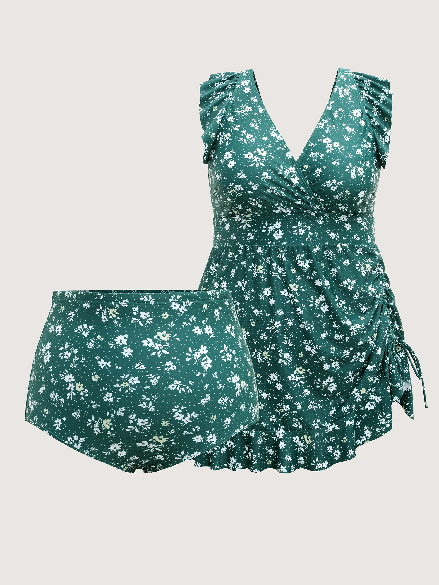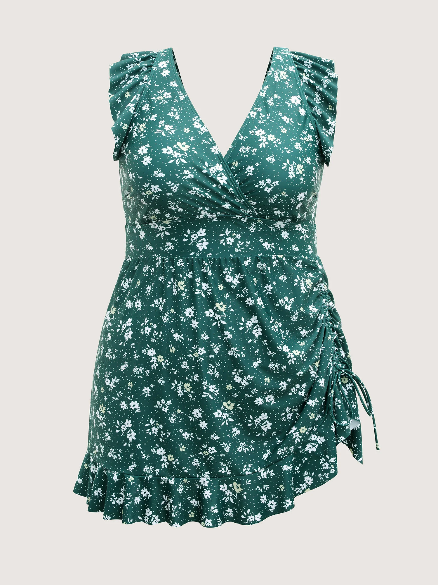 Ruched Drawstring Flutter Hem Swim Dress