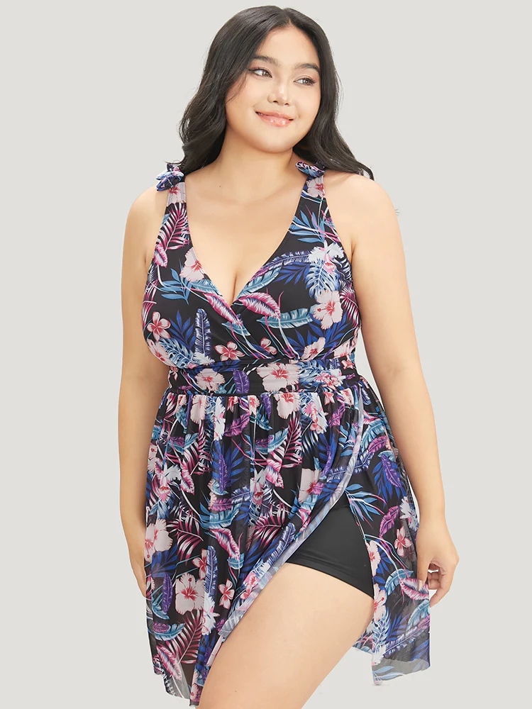 Tropical Print Bow Sculpt Waist Split Swim Dress