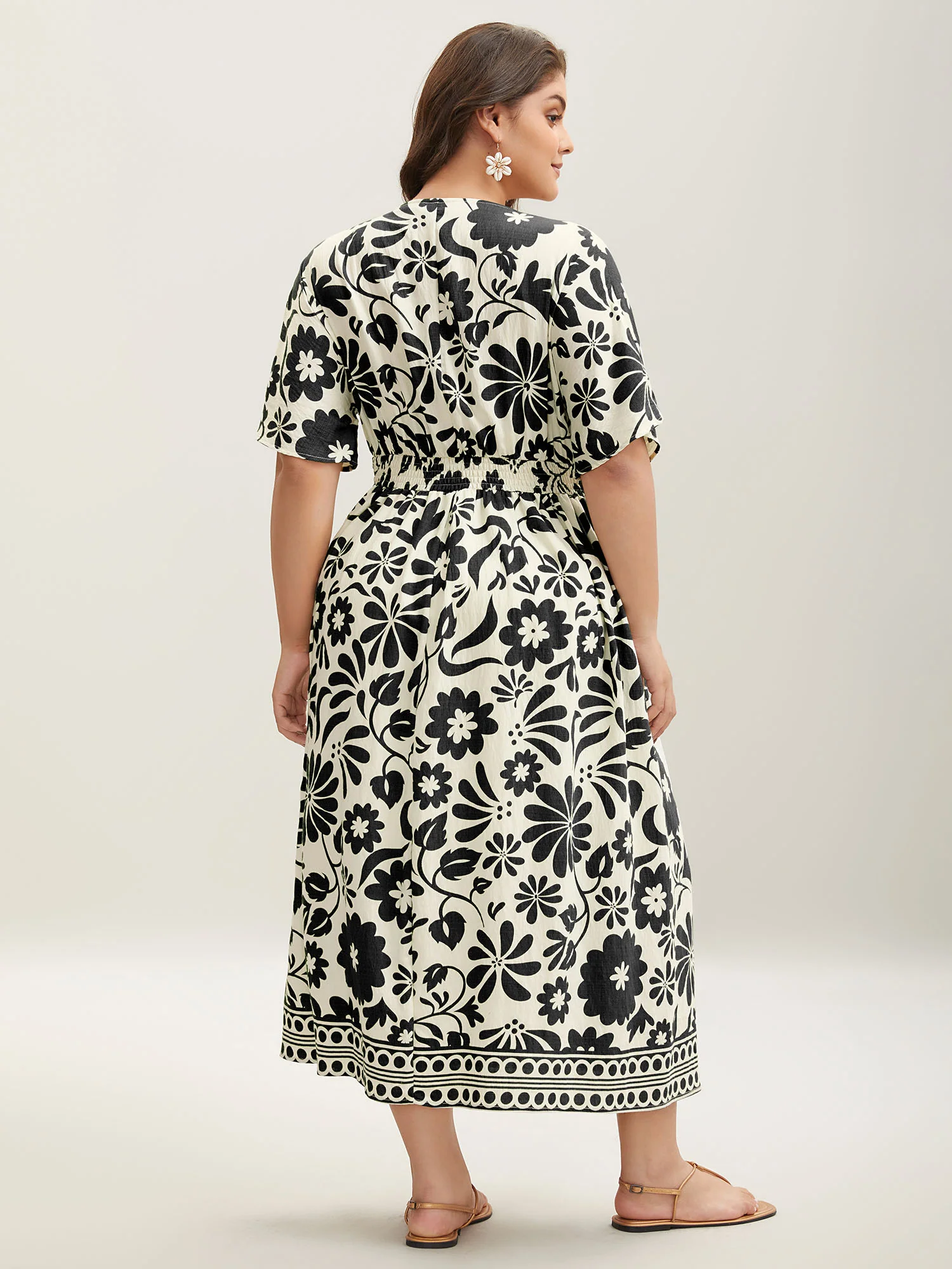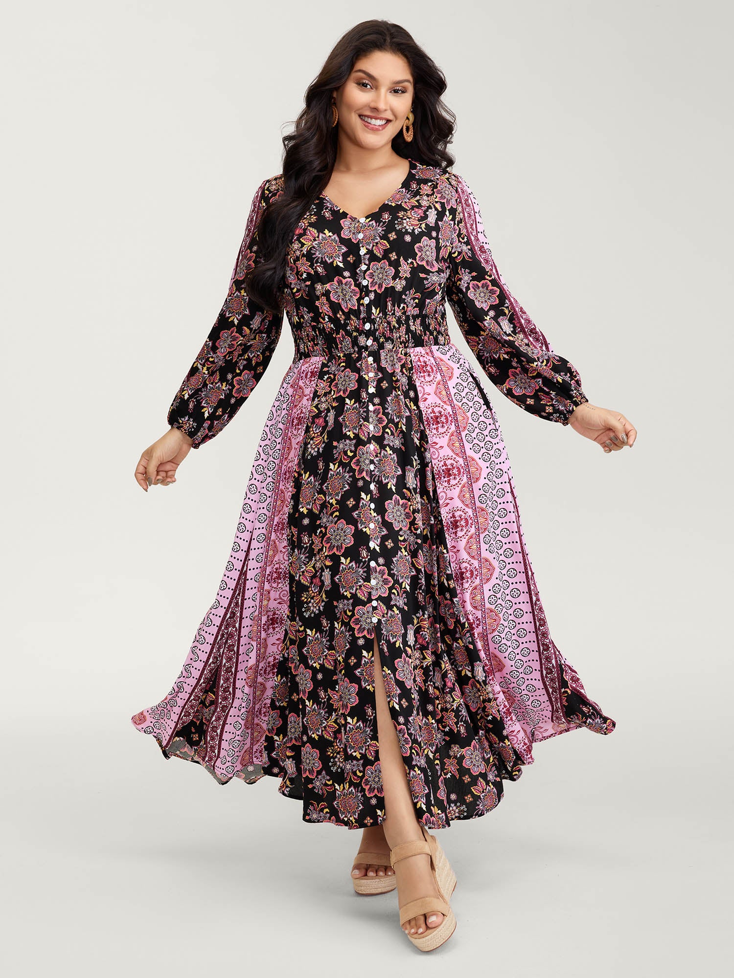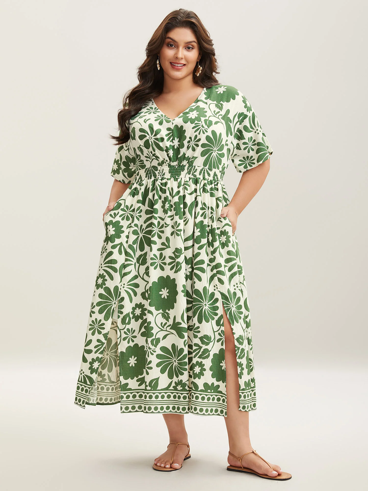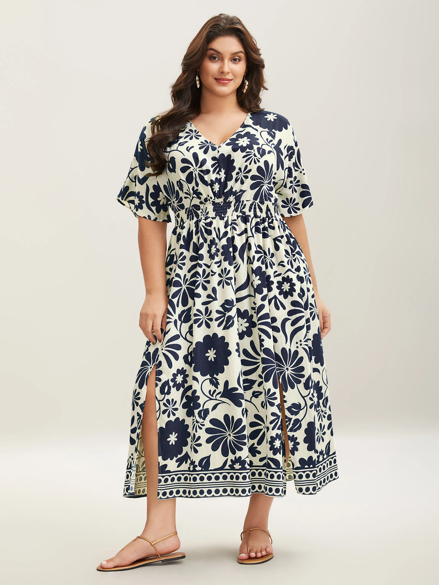 Rayon Stretchy Waist Boho Slit Midi Dress